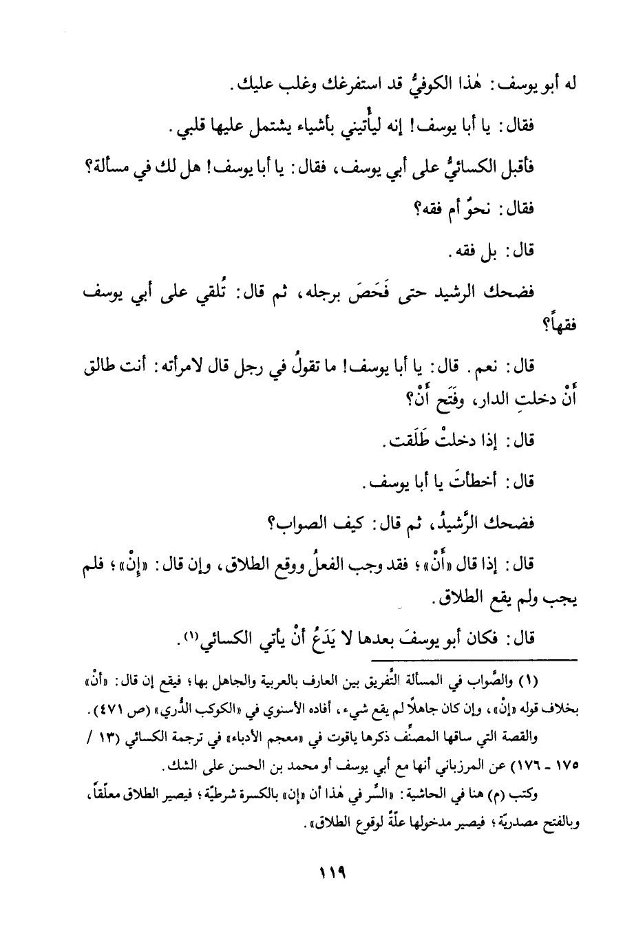 فَأَقْبَلَ الْكِسَائِيُّ عَلَى أَبِي يُوسُفَ، فَقَالَ: يَا أَبَا يُوسُفَ! هَلْ لَكَ فِي مَسْأَلَةٍ؟
