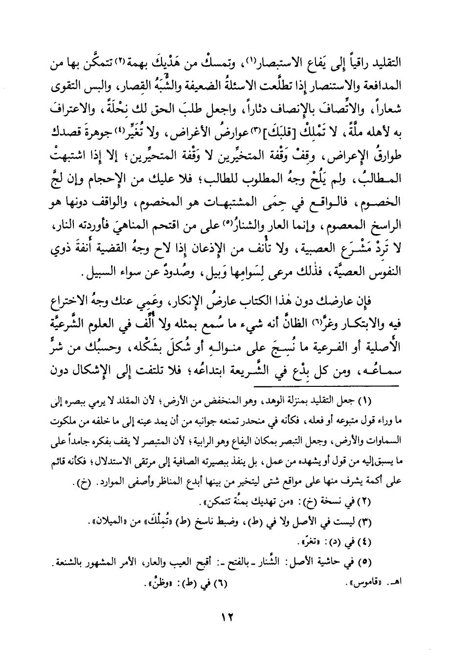 فَإِنْ عَارَضَكَ دُونَ هَذَا الْكِتَابِ عَارِضُ الْإِنْكَارِ، وَعَمِيَ عَنْكَ وَجْهُ الِاخْتِرَاعِ فِيهِ وَالِابْتِكَارِ وَغَرَّ6 الظَّانَّ أَنَّهُ شَيْءٌ مَا سُمع بِمِثْلِهِ وَلَا أُلِّفَ فِي الْعُلُومِ الشَّرْعِيَّةِ الْأَصْلِيَّةِ أَوِ الْفَرْعِيَّةِ مَا نُسج عَلَى مِنْوَالِهِ أَوْ شُكل بِشَكْلِهِ، وَحَسْبُكَ مِنْ شَرٍّ سَمَاعُهُ، وَمِنْ كُلِّ بِدْعٍ فِي الشَّرِيعَةِ ابْتِدَاعُهُ؛ فَلَا تَلْتَفِتْ إِلَى الْإِشْكَالِ دون