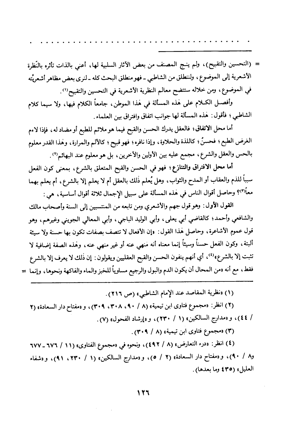 = "التحسين والتقبيح"، ولم ينج المصنف من بعض الآثار السلبية لها، أعني بالذات تأثره بالنظرة الأشعرية إلى الموضوع، ولننطلق من الشاطبي -فهو منطلق البحث كله- لنرى بعض مظاهر أشعريته في الموضوع، ومن خلاله ستتضح معالم النظرية الأشعرية في التحسين والتقبيح*.
