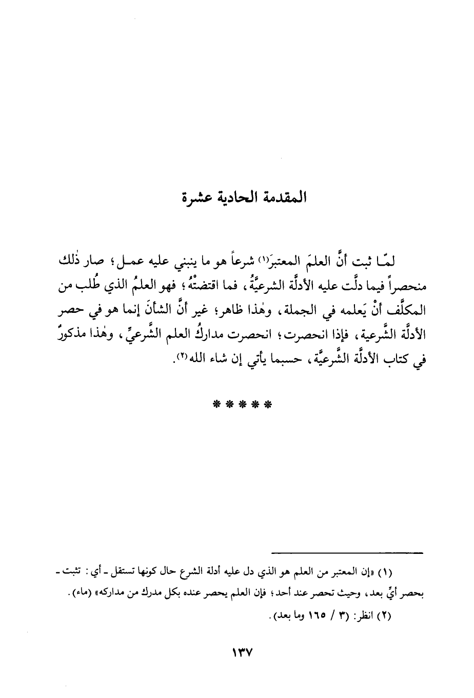 لَمَّا ثَبَتَ أَنَّ الْعِلْمَ الْمُعْتَبَرَ1 شَرْعًا هُوَ مَا يَنْبَنِي عَلَيْهِ عَمَلٌ؛ صَارَ ذَلِكَ مُنْحَصِرًا فِيمَا دَلَّتْ عَلَيْهِ الْأَدِلَّةُ الشَّرْعِيَّةُ، فَمَا اقْتَضَتْهُ؛ فَهُوَ الْعِلْمُ الَّذِي طُلِبَ مِنَ الْمُكَلَّفِ أَنْ يَعْلَمَهُ فِي الْجُمْلَةِ، وَهَذَا ظَاهِرٌ؛ غَيْرَ أَنَّ الشَّأْنَ إِنَّمَا هُوَ فِي حَصْرِ الْأَدِلَّةِ الشَّرْعِيَّةِ، فَإِذَا انْحَصَرَتْ؛ انْحَصَرَتْ مَدَارِكُ الْعِلْمِ الشَّرْعِيِّ، وَهَذَا مَذْكُورٌ فِي كِتَابِ الْأَدِلَّةِ الشَّرْعِيَّةِ، حَسْبَمَا يَأْتِي إن شاء الله2.