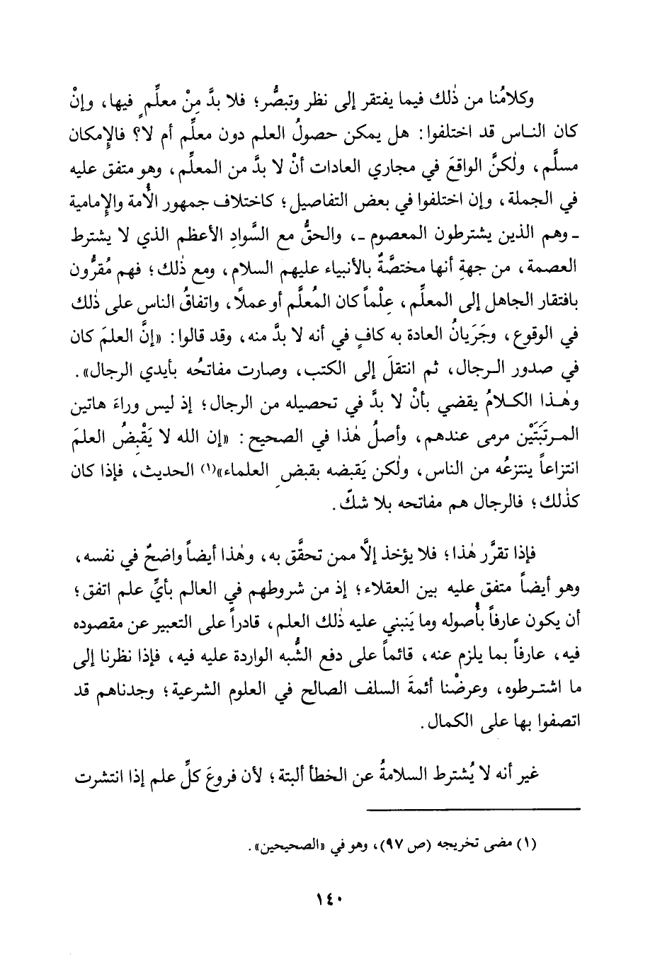 وَكَلَامُنَا مِنْ ذَلِكَ فِيمَا يَفْتَقِرُ إِلَى نَظَرٍ وَتَبَصُّرٍ؛ فَلَا بُدَّ مِنْ مُعَلِّمٍ فِيهَا، وَإِنْ كَانَ النَّاسُ قَدِ اخْتَلَفُوا: هَلْ يُمْكِنُ حُصُولُ الْعِلْمِ دُونَ مُعَلِّمٍ أَمْ لَا؟ فَالْإِمْكَانُ مُسَلَّمٌ، ولكن الواقع في مجاري العادات أن لا بد مِنَ الْمُعَلِّمِ، وَهُوَ مُتَّفَقٌ عَلَيْهِ فِي الْجُمْلَةِ، وَإِنِ اخْتَلَفُوا فِي بَعْضِ التَّفَاصِيلِ؛ كَاخْتِلَافِ جُمْهُورِ الْأُمَّةِ وَالْإِمَامِيَّةِ -وَهُمُ الَّذِينَ يَشْتَرِطُونَ الْمَعْصُومَ- وَالْحَقُّ مَعَ السَّوَادِ الْأَعْظَمِ الَّذِي لَا يَشْتَرِطُ الْعِصْمَةَ، مِنْ جِهَةِ أَنَّهَا مُخْتَصَّةٌ بِالْأَنْبِيَاءِ عَلَيْهِمُ السَّلَامُ، وَمَعَ ذَلِكَ؛ فَهُمْ مُقِرُّونَ بِافْتِقَارِ الْجَاهِلِ إِلَى الْمُعَلِّمِ، عِلْمًا كَانَ الْمُعَلَّمُ أَوْ عَمَلًا، وَاتِّفَاقُ النَّاسِ عَلَى ذَلِكَ فِي الْوُقُوعِ، وَجَرَيَانُ الْعَادَةِ بِهِ كافٍ فِي أَنَّهُ لَا بُدَّ مِنْهُ، وَقَدْ قَالُوا: "إِنَّ الْعِلْمَ كَانَ فِي صُدُورِ الرِّجَالِ، ثُمَّ انْتَقَلَ إِلَى الْكُتُبِ، وَصَارَتْ مَفَاتِحُهُ بِأَيْدِي الرِّجَالِ".