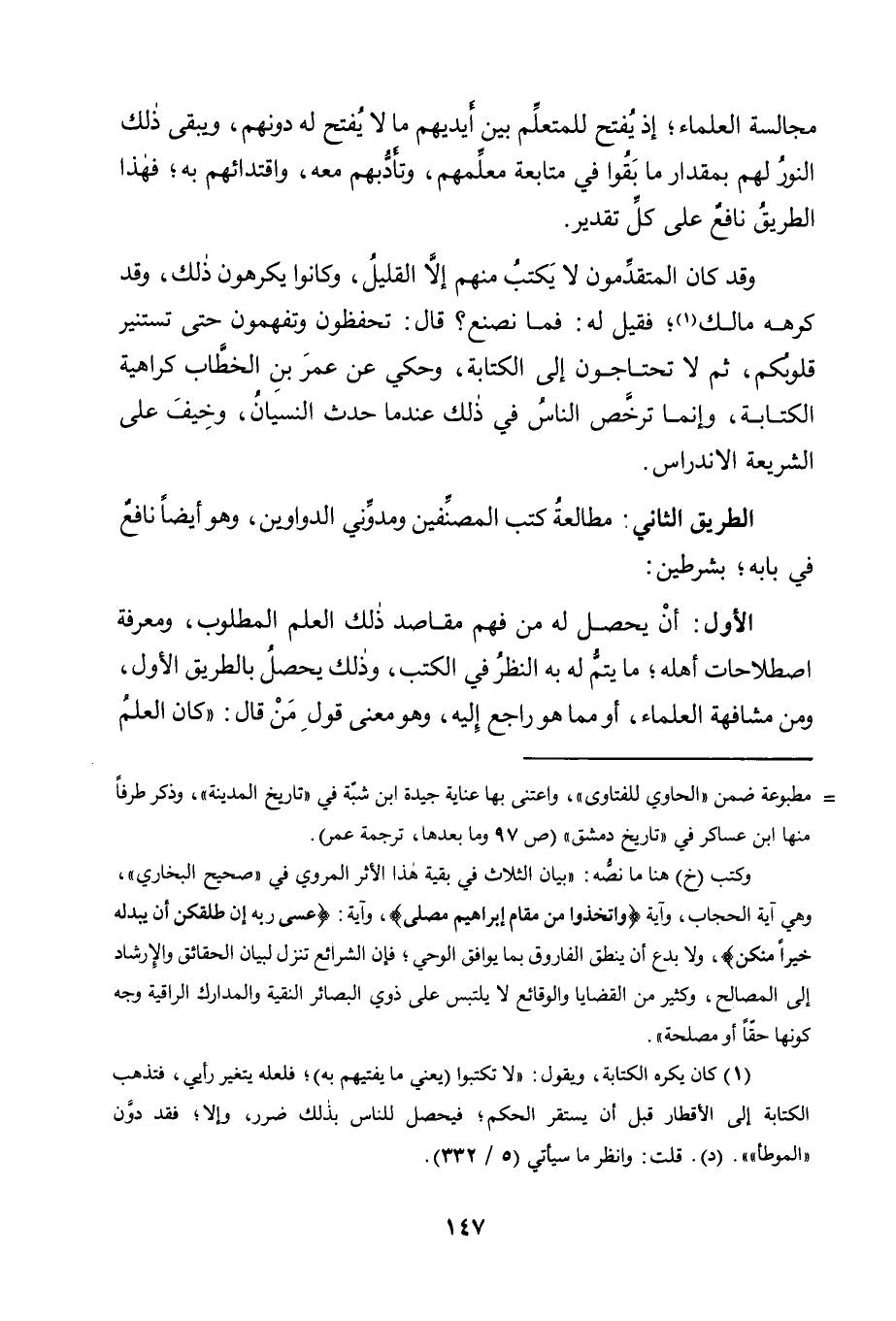 وَقَدْ كَانَ الْمُتَقَدِّمُونَ لَا يَكْتُبُ مِنْهُمْ إِلَّا الْقَلِيلُ، وَكَانُوا يَكْرَهُونَ ذَلِكَ، وَقَدْ كَرِهَهُ مَالِكٌ1؛ فَقِيلَ لَهُ: فَمَا نَصْنَعُ؟ قَالَ: تَحْفَظُونَ وَتَفْهَمُونَ حَتَّى تَسْتَنِيرَ قُلُوبُكُمْ، ثُمَّ لَا تَحْتَاجُونَ إِلَى الْكِتَابَةِ، وَحُكِيَ عَنْ عُمَرَ بْنِ الْخَطَّابِ كَرَاهِيَةُ الْكِتَابَةِ، وَإِنَّمَا تَرَخَّصَ النَّاسُ فِي ذَلِكَ عِنْدَمَا حَدَثَ النِّسْيَانُ، وخِيفَ عَلَى الشَّرِيعَةِ الِانْدِرَاسُ.