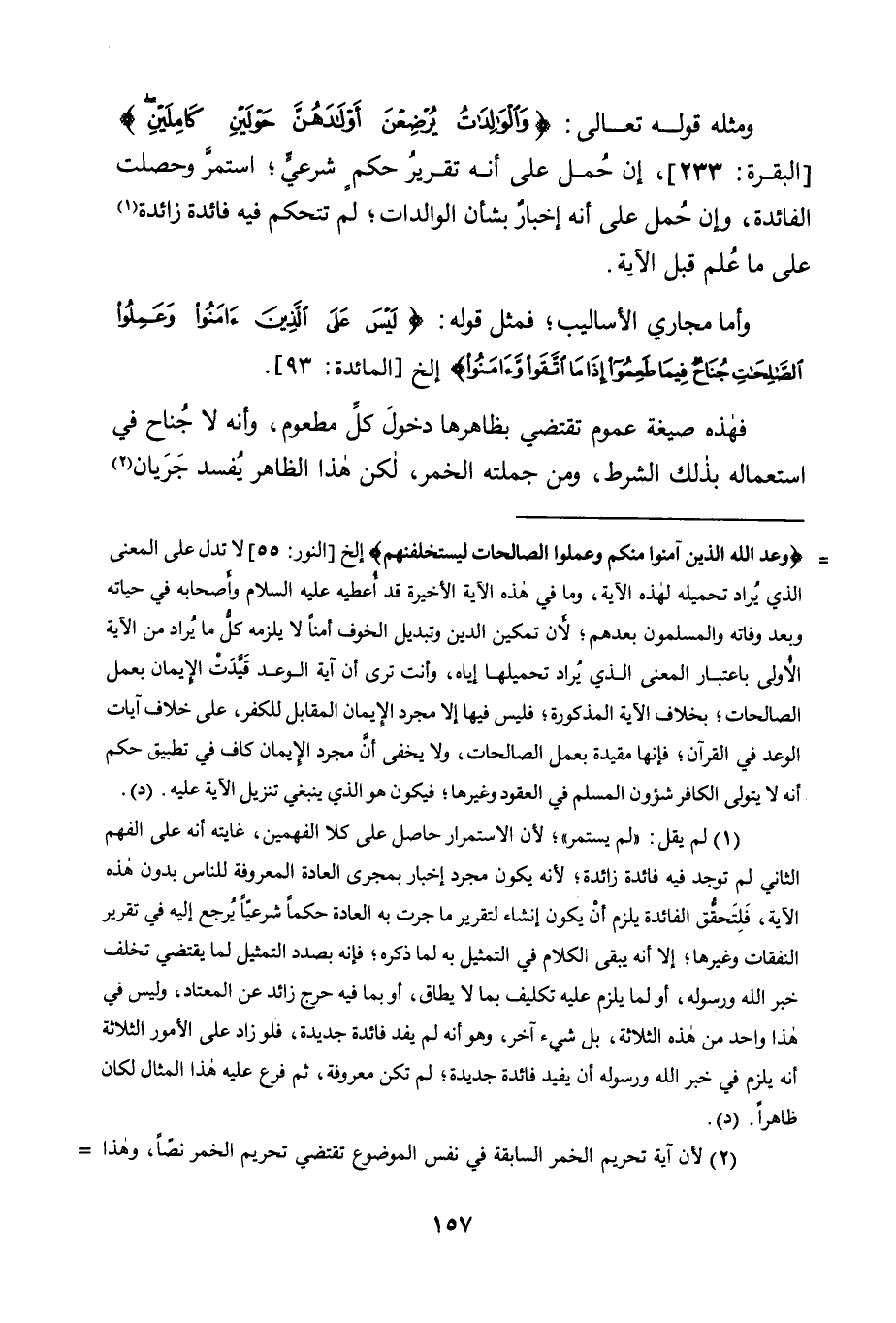 1 لم يقل: "لم يستمر"؛ لأن الاستمرار حاصل على كلا الفهمين، غايته أنه على الفهم الثاني لم توجد فيه فائدة زائدة؛ لأنه يكون مجرد إخبار بمجرى العادة المعروفة للناس بدون هذه الآية، فلتحقق الفائدة يلزم أن يكون إنشاء لتقرير ما جرت به العادة حكما شرعيا يرجع إليه في تقرير النفقات وغيرها؛ إلا أنه يبقى الكلام في التمثيل به لما ذكره؛ فإنه بصدد التمثيل لما يقتضي تخلف خبر الله ورسوله، أو لما يلزم عليه تكليف بما لا يطاق، أو بما فيه حرج زائد عن المعتاد، وليس في هذا واحد من هذه الثلاثة، بل شيء آخر، وهو أنه لم يفد فائدة جديدة، فلو زاد على الأمور الثلاثة أنه يلزم في خبر الله ورسوله أن يفيد فائدة جديدة؛ لم تكن معروفة، ثم فرع عليه هذا المثال لكان ظاهرا "د".