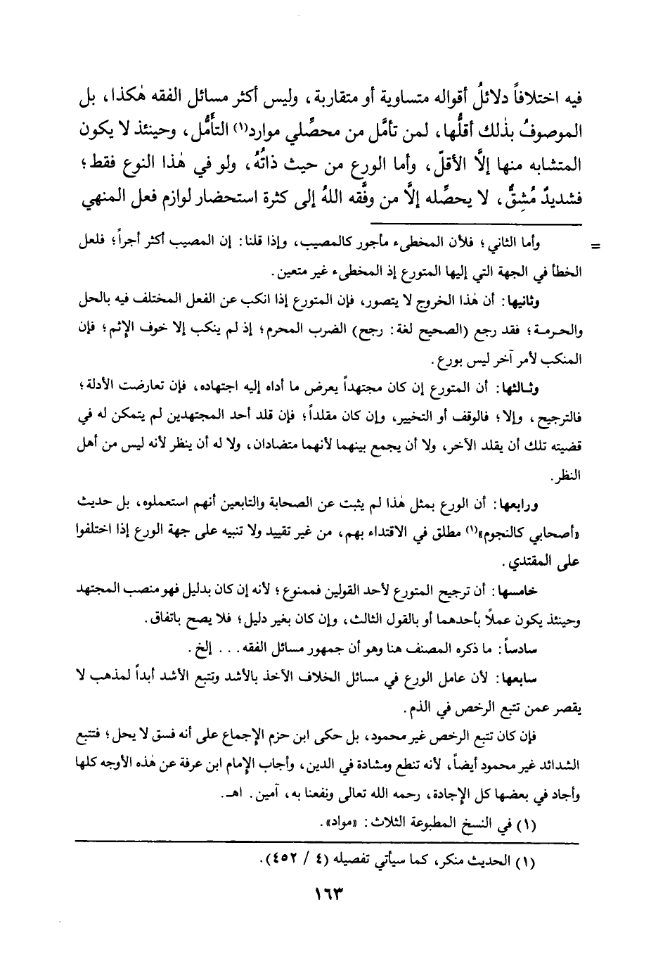 ورابعها: أن الورع بمثل هذا لم يثبت عن الصحابة والتابعين أنهم استعملوه، بل حديث "أصحابي كالنجوم" 1 مطلق في الاقتداء بهم، من غير تقييد ولا تنبيه على جهة الورع إذا اختلفوا على المقتدي.