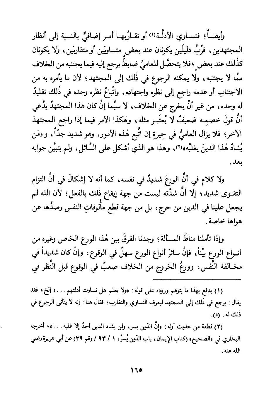 وَأَيْضًا؛ فَتَسَاوِي الْأَدِلَّةِ1 أَوْ تَقَارُبُهَا أَمْرٌ إِضَافِيٌّ بِالنِّسْبَةِ إِلَى أَنْظَارِ الْمُجْتَهِدِينَ، فَرُبَّ دَلِيلَيْنِ يَكُونَانِ عِنْدَ بَعْضٍ مُتَسَاوِيَيْنِ أَوْ مُتَقَارِبَيْنِ، وَلَا يَكُونَانِ كَذَلِكَ عِنْدَ بَعْضٍ؛ فَلَا يَتَحَصَّلُ لِلْعَامِّيِّ ضَابِطٌ يَرْجِعُ إِلَيْهِ فِيمَا يَجْتَنِبُهُ مِنَ الْخِلَافِ مِمَّا لَا يَجْتَنِبُهُ، وَلَا يُمْكِنُهُ الرُّجُوعُ فِي ذَلِكَ إِلَى الْمُجْتَهِدِ؛ لِأَنَّ مَا يَأْمُرُهُ بِهِ مِنَ الِاجْتِنَابِ أَوْ عَدَمِهِ رَاجِعٌ إِلَى نَظَرِهِ وَاجْتِهَادِهِ، وَاتِّبَاعُ نَظَرِهِ وَحْدَهُ فِي ذَلِكَ تَقْلِيدٌ لَهُ وحده، مِنْ غَيْرِ أَنْ يَخْرُجَ عَنِ الْخِلَافِ، لَا سِيَّمَا إِنْ كَانَ هَذَا الْمُجْتَهِدُ يَدَّعِي أَنَّ قَوْلَ خَصْمِهِ ضَعِيفٌ لَا يُعْتَبَرُ مِثْلُهُ، وَهَكَذَا الْأَمْرُ فِيمَا إِذَا رَاجَعَ الْمُجْتَهِدَ الْآخَرَ؛ فَلَا يَزَالُ الْعَامِّيُّ فِي حَيْرَةٍ إِنِ اتَّبَعَ هَذِهِ الأمور، وهو شديد جدا، و "من يُشَادَّ هَذَا الدِّينَ يَغْلِبْهُ" 2، وَهَذَا هُوَ الَّذِي أَشْكَلَ عَلَى السَّائِلِ، وَلَمْ يَتَبَيَّنْ جَوَابُهُ بَعْدُ.
