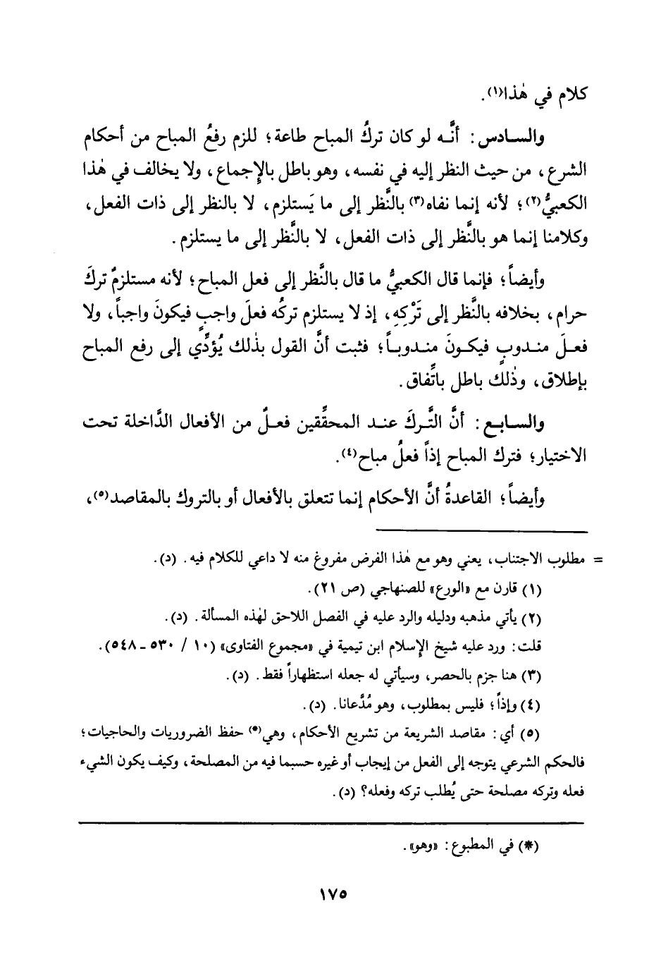 أَنَّهُ لَوْ كَانَ تَرْكُ الْمُبَاحِ طَاعَةً؛ لَلَزِمَ رَفْعُ الْمُبَاحِ مِنْ أَحْكَامِ الشَّرْعِ، مِنْ حَيْثُ النَّظَرُ إِلَيْهِ فِي نَفْسِهِ، وَهُوَ بَاطِلٌ بِالْإِجْمَاعِ، وَلَا يُخَالِفُ فِي هَذَا الْكَعْبِيُّ2؛ لِأَنَّهُ إِنَّمَا نَفَاهُ3 بِالنَّظَرِ إِلَى مَا يَسْتَلْزِمُ، لَا بِالنَّظَرِ إِلَى ذَاتِ الْفِعْلِ، وَكَلَامُنَا إِنَّمَا هُوَ بِالنَّظَرِ إِلَى ذَاتِ الْفِعْلِ، لَا بِالنَّظَرِ إِلَى مَا يَسْتَلْزِمُ.