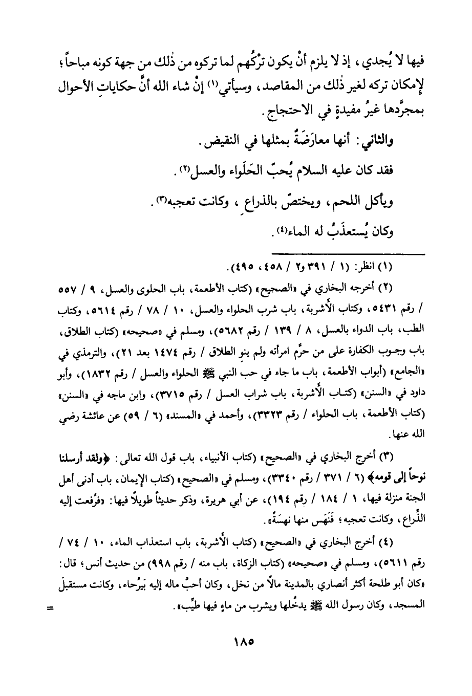 2 أخرجه البخاري في "الصحيح" "كتاب الأطعمة، باب الحلوى والعسل، 9/ 557/ رقم 5431، وكتاب الأشربة، باب شرب الحلواء والعسل، 10/ 78/ رقم 5614، وكتاب الطب، باب الدواء بالعسل، 8/ 139/ رقم 5682"، ومسلم في "صحيحه" "كتاب الطلاق، باب وجوب الكفارة على من حرم امرأته ولم ينو الطلاق/ رقم 1474 بعد 21"، والترمذي في "الجامع" "أبواب الأطعمة، باب ما جاء في حب النبي -صلى الله عليه وسلم- الحلواء والعسل/ رقم 1832"، وأبو داود في "السنن" "كتاب الأشربة، باب شراب العسل/ رقم 3715"، وابن ماجه في "السنن" "كتاب الأطعمة، باب الحلواء/ رقم 3323"، وأحمد في "المسند" "6/ 59" عن عائشة, رضي الله عنها.