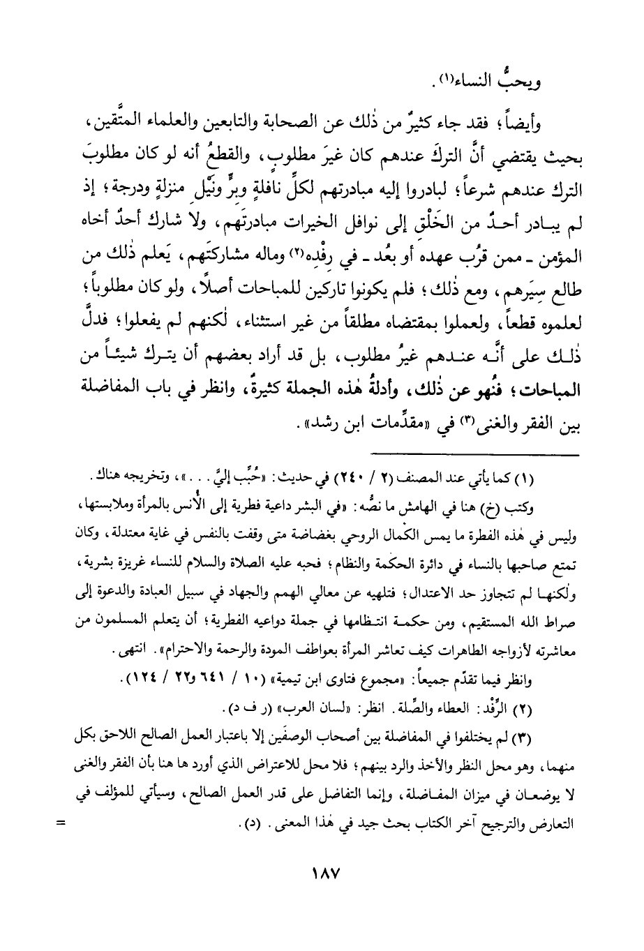 3 لم يختلفوا في المفاضلة بين أصحاب الوصفين إلا باعتبار العمل الصالح اللاحق بكل منهما، وهو محل النظر والأخذ والرد بينهم؛ فلا محل للاعتراض الذي أوردها هنا بأن الفقر والغنى لا يوضعان في ميزان المفاضلة، وإنما التفاضل على قدر العمل الصالح، وسيأتي للمؤلف في التعارض والترجيح آخر الكتاب بحث جيد في هذا المعنى. "د". =