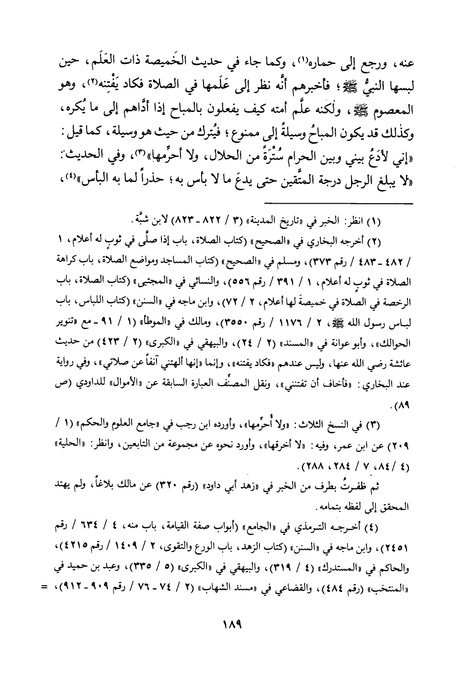 2 أخرجه البخاري في "الصحيح" "كتاب الصلاة، باب إذا صلى في ثوب له أعلام، 1/ 482-483/ رقم 373"، ومسلم في "الصحيح" "كتاب المساجد ومواضع الصلاة، باب كراهة الصلاة في ثوب له أعلام، 1/ 391/ رقم 556"، والنسائي في "المجتبى" "كتاب الصلاة, باب الرخصة في الصلاة في خميصة لها أعلام 2/ 72", وابن ماجه في "السنن" "كتاب اللباس، باب لباس رسول الله, صلى الله عليه وسلم 2/ 1176/ رقم 3550"، ومالك في "الموطأ" "1/ 91- مع "تنوير الحوالك""، وأبو عوانة في "المسند" "2/ 24"، والبيهقي في "الكبرى" "2/ 423" من حديث عائشة -رضي الله عنها- وليس عندهم "فكاد يفتنه"، وإنما "إنها ألهتني آنفا عن صلاتي"، وفي رواية عند البخاري: "فأخاف أن تفتنني"، ونقل المصنف العبارة السابقة عن "الأموال" للداودي "ص89".