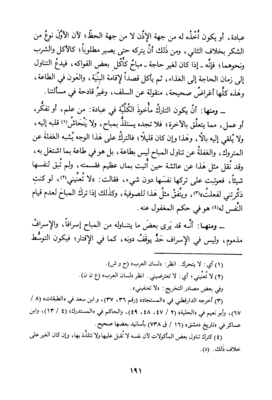- وَمِنْهَا: أَنْ يَكُونَ التَّارِكُ مَأْخُوذَ الْكُلِّيَّةِ فِي عِبَادَةٍ: مِنْ عِلْمٍ، أَوْ تَفَكُّرٍ، أَوْ عَمِلٍ، مِمَّا يَتَعَلَّقُ بِالْآخِرَةِ؛ فَلَا تَجِدُهُ يَسْتَلِذُّ بِمُبَاحٍ، وَلَا يَنْحَاشُ1 قَلْبُهُ إِلَيْهِ، وَلَا يُلْقِي إِلَيْهِ بَالًا، وَهَذَا وَإِنْ كَانَ قَلِيلًا؛ فَالتَّرْكُ عَلَى هَذَا الْوَجْهِ يُشْبِهُ الْغَفْلَةَ عَنِ الْمَتْرُوكِ، وَالْغَفْلَةُ عَنْ تَنَاوُلِ الْمُبَاحِ لَيْسَ بِطَاعَةٍ، بَلْ هُوَ فِي طَاعَةٍ بِمَا اشْتَغَلَ بِهِ، وَقَدْ نُقِلَ مِثْلُ هَذَا عَنْ عَائِشَةَ حِينَ أُتيت بِمَالٍ عَظِيمٍ فَقَسَّمَتْهُ، وَلَمْ تُبْقِ لِنَفْسِهَا شَيْئًا, فعُوتبت عَلَى تَرْكِهَا نَفْسَهَا دُونَ شَيْءٍ، فَقَالَتْ: "لَا تُعنِّيني2، لَوْ كُنْتِ ذَكَّرْتِنِي لَفَعَلْتُ"3، وَيَتَّفِقُ مِثْلُ هَذَا لِلصُّوفِيَّةِ، وَكَذَلِكَ إِذَا تَرَكَ الْمُبَاحَ لِعَدَمِ قِيَامِ النَّفْسِ لَهُ4 هُوَ فِي حُكْمِ الْمَغْفُولِ عَنْهُ.
