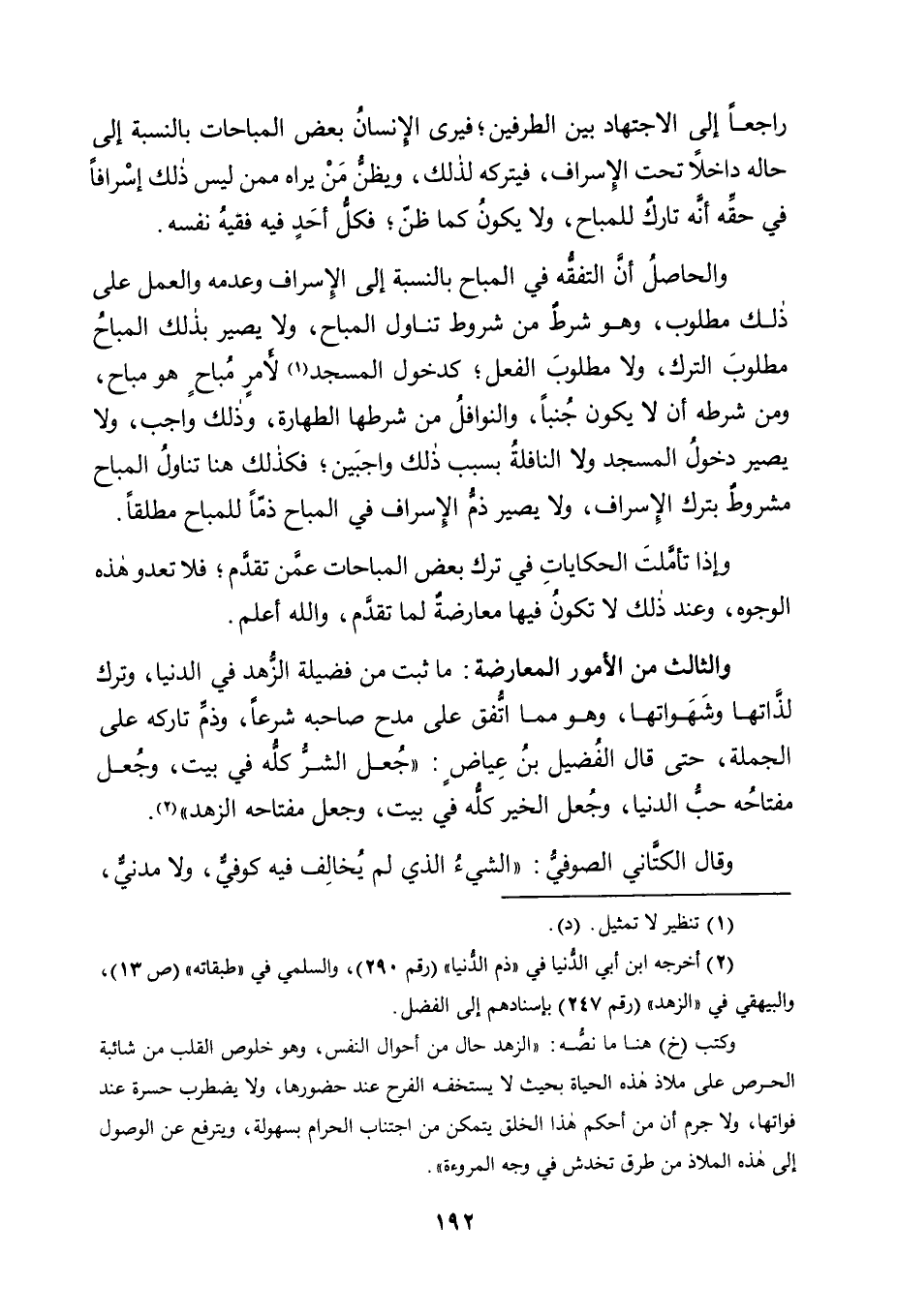 رَاجِعًا إِلَى الِاجْتِهَادِ بَيْنَ الطَّرَفَيْنِ؛ فَيَرَى الْإِنْسَانُ بَعْضَ الْمُبَاحَاتِ بِالنِّسْبَةِ إِلَى حَالِهِ دَاخِلًا تَحْتَ الْإِسْرَافِ، فَيَتْرُكُهُ لِذَلِكَ، وَيَظُنُّ مَنْ يَرَاهُ مِمَّنْ لَيْسَ ذَلِكَ إِسْرَافًا فِي حَقِّهِ أَنَّهُ تَارِكٌ لِلْمُبَاحِ، وَلَا يَكُونُ كَمَا ظَنَّ؛ فَكُلُّ أَحَدٍ فِيهِ فَقِيهُ نَفْسِهِ.