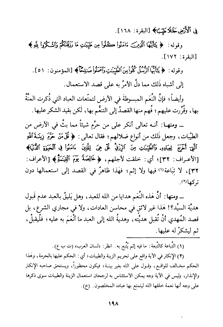 2 الإنكار في الآية واقع على تحريم الزينة والطيبات؛ أي: الحكم عليها بالحرمة، وهذا الحكم مخالف للواقع, وقول على الله بغير بينة؛ فيكون محظورا، ويستحق صاحبه الإنكار والإنذار، وليس في الآية وجه يمكن الاستئناس به لرجحان استعمال الزينة والطيبات سوى ذكرها على وجه أنها نعمة خلقها الله ليتمتع بها عباده المخلصون. "خ".