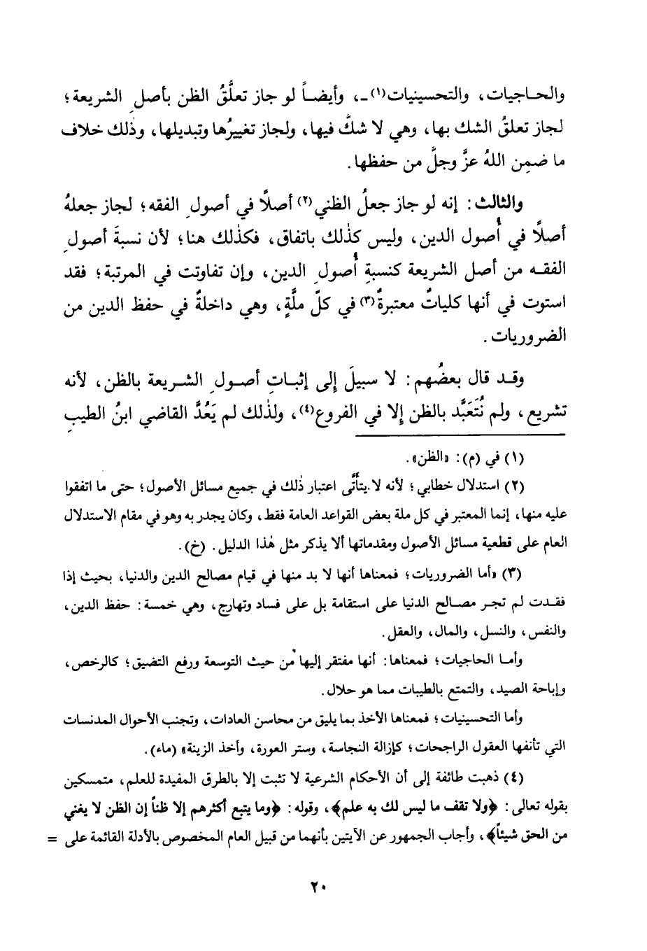 وَالْحَاجِيَّاتِ، وَالتَّحْسِينِيَّاتِ1-، وَأَيْضًا لَوْ جَازَ تَعَلُّقُ الظَّنِّ بِأَصْلِ الشَّرِيعَةِ؛ لَجَازَ تَعَلُّقُ الشَّكِّ بِهَا، وَهِيَ لَا شَكَّ فِيهَا، وَلَجَازَ تَغْيِيرُهَا وَتَبْدِيلُهَا، وَذَلِكَ خِلَافَ مَا ضَمِنَ اللَّهُ -عَزَّ وَجَلَّ- مِنْ حِفْظِهَا.