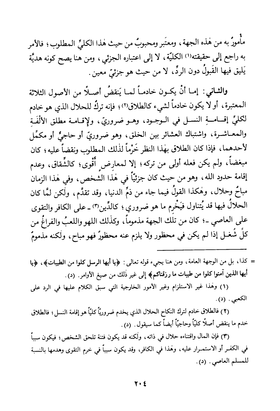 وَالثَّانِي: إِمَّا أَنْ يَكُونَ خَادِمًا لِمَا يَنْقُضُ أَصْلًا مِنَ الْأُصُولِ الثَّلَاثَةِ الْمُعْتَبَرَةِ، أَوْ لَا يَكُونَ خَادِمًا لِشَيْءٍ كَالطَّلَاقِ2؛ فَإِنَّهُ تَرْكٌ لِلْحَلَالِ الَّذِي هُوَ خَادِمٌ لِكُلِّيِّ إِقَامَةِ النَّسْلِ فِي الْوُجُودِ، وَهُوَ ضَرُورِيٌّ، وَلِإِقَامَةِ مُطْلَقِ الْأُلْفَةِ وَالْمُعَاشَرَةِ، وَاشْتِبَاكِ الْعَشَائِرِ بَيْنَ الْخَلْقِ، وَهُوَ ضَرُورِيٌّ أَوْ حَاجِيٌّ أَوْ مُكَمِّلٌ لِأَحَدِهِمَا، فَإِذَا كَانَ الطَّلَاقُ بِهَذَا النَّظَرِ خَرْمًا لِذَلِكَ الْمَطْلُوبِ وَنَقْضًا عَلَيْهِ؛ كَانَ مُبَغَّضًا، وَلَمْ يَكُنْ فِعْلُهُ أَوْلَى مِنْ تَرْكِهِ؛ إِلَّا لِمُعَارِضٍ أَقْوَى؛ كَالشِّقَاقِ, وَعَدَمِ إِقَامَةِ حُدُودِ اللَّهِ, وَهُوَ مِنْ حَيْثُ كَانَ جُزْئِيًّا فِي هَذَا الشَّخْصِ، وَفِي هَذَا الزَّمَانِ مُبَاحٌ وَحَلَالٌ، وَهَكَذَا الْقَوْلُ فِيمَا جَاءَ مِنْ ذَمِّ الدُّنْيَا، وَقَدْ تَقَدَّمَ، وَلَكِنْ لَمَّا كَانَ الْحَلَالُ فِيهَا قَدْ يُتَنَاوَلُ فَيَخْرِمُ مَا هُوَ ضَرُورِيٌّ؛ كَالدِّينِ3 -عَلَى الْكَافِرِ وَالتَّقْوَى عَلَى الْعَاصِي- كَانَ مِنْ تِلْكَ الْجِهَةِ مَذْمُومًا، وَكَذَلِكَ اللَّهْوُ وَاللَّعِبُ وَالْفَرَاغُ مِنْ كُلِّ شُغْلٍ إِذَا لَمْ يَكُنْ فِي مَحْظُورٍ وَلَا يَلْزَمُ عنه محظور فهو مباح، ولكنه مذموم