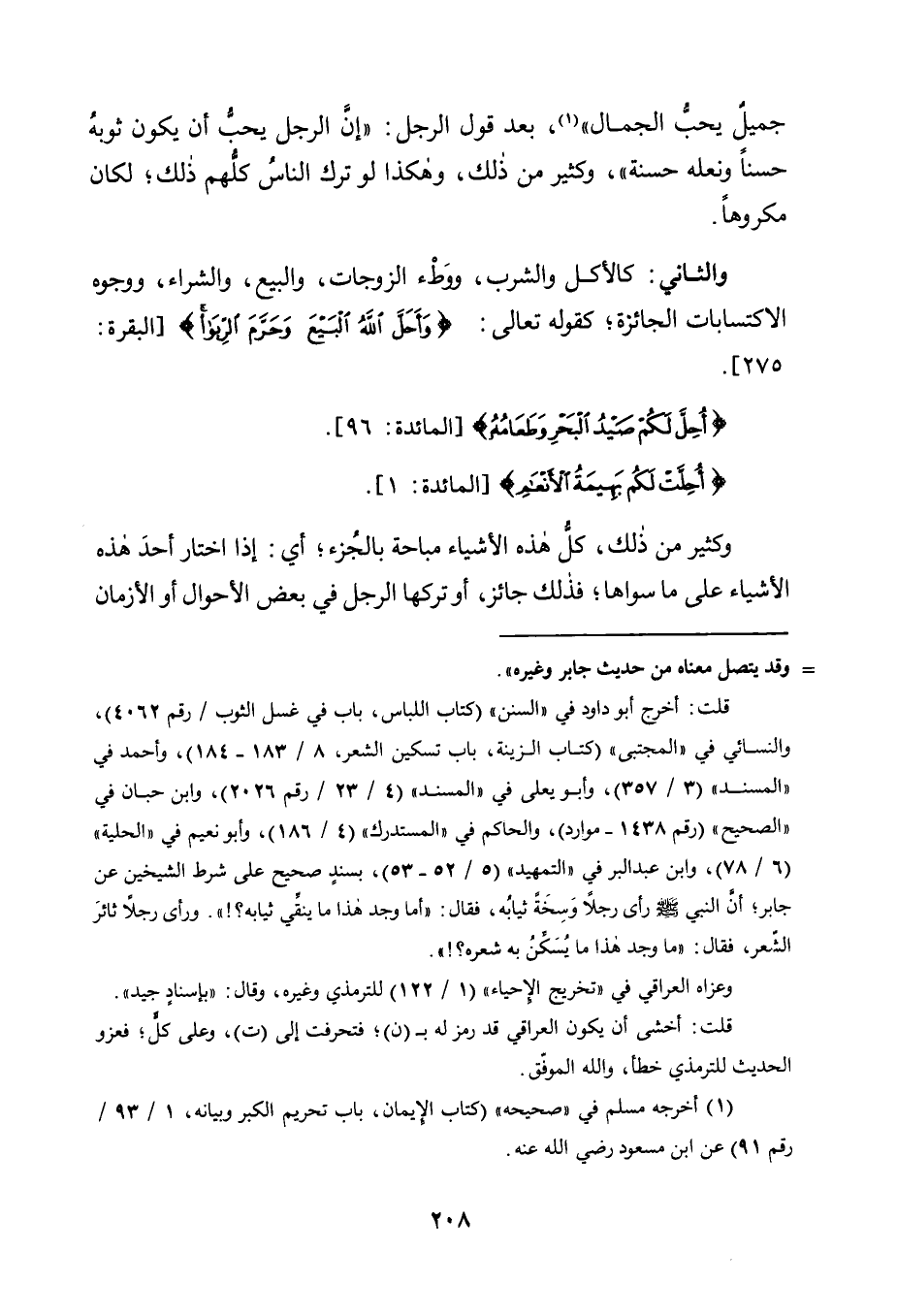جَمِيلٌ يُحِبُّ الْجَمَالَ" 1، بَعْدَ قَوْلِ الرَّجُلِ: "إِنَّ الرَّجُلَ يُحِبُّ أَنْ يَكُونَ ثَوْبُهُ حَسَنًا وَنَعْلُهُ حَسَنَةً"، وَكَثِيرٌ مِنْ ذَلِكَ، وَهَكَذَا لَوْ تَرَكَ النَّاسُ كُلُّهُمْ ذَلِكَ؛ لَكَانَ مَكْرُوهًا.
