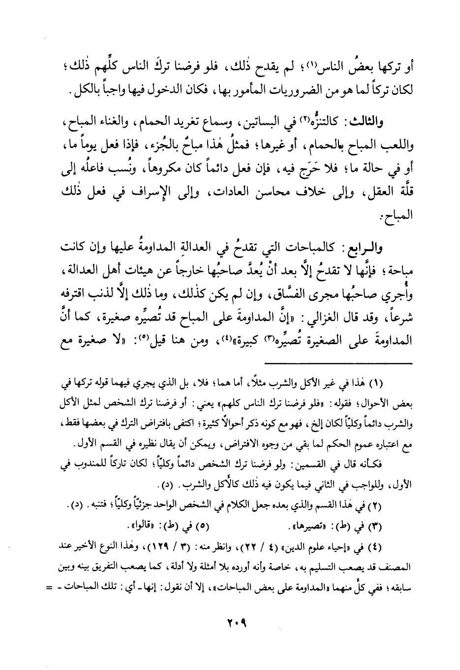 4 في "إحياء علوم الدين" "4/ 22"، وانظر منه: "3/ 129"، وهذا النوع الأخير عند المصنف قد يصعب التسليم به، خاصة وأنه أورده بلا أمثلة ولا أدلة، كما يصعب التفريق بينه وبين سابقه؛ ففي كل منهما "المداومة على بعض المباحات"، إلا أن نقول: إنها -أي: تلك المباحات- تصير محرمة بالإدمان عليها والإفراط فيها؛ لأنها حينئذ تصير هوى متبعا، وآفة مستحكمة، ومضيعة للعمر، وفي هذا من موجبات التحريم ما لا يخفى، ومن الأمثلة الجلية على هذا احتراف بعض الناس اليوم لبعض أنواع اللعب, فيصير الإنسان حرفته "لاعب"، وتصير حياته لعبا في لعب، وقريب من هذا ما يداوم عليه بعض الناس من قطع الساعات الطوال من كل أيامهم أو معظمها في المقاهي وما أشبهها من توافه الأمور وسفاسفها، أفاده الريسوني.