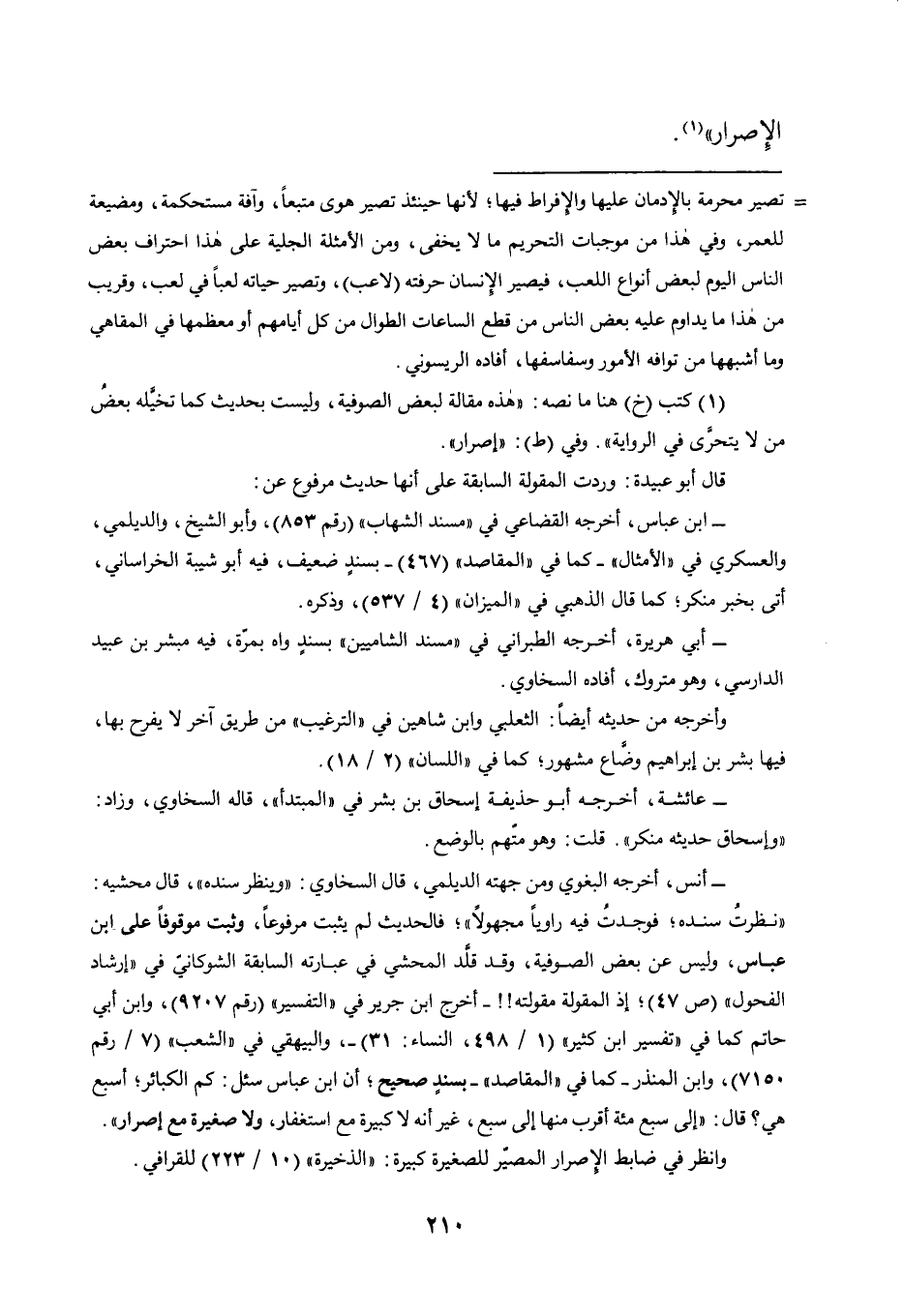 وانظر في ضابط الإصرار المصير للصغيرة كبيرة: "الذخيرة" "10/ 223" للقرافي.