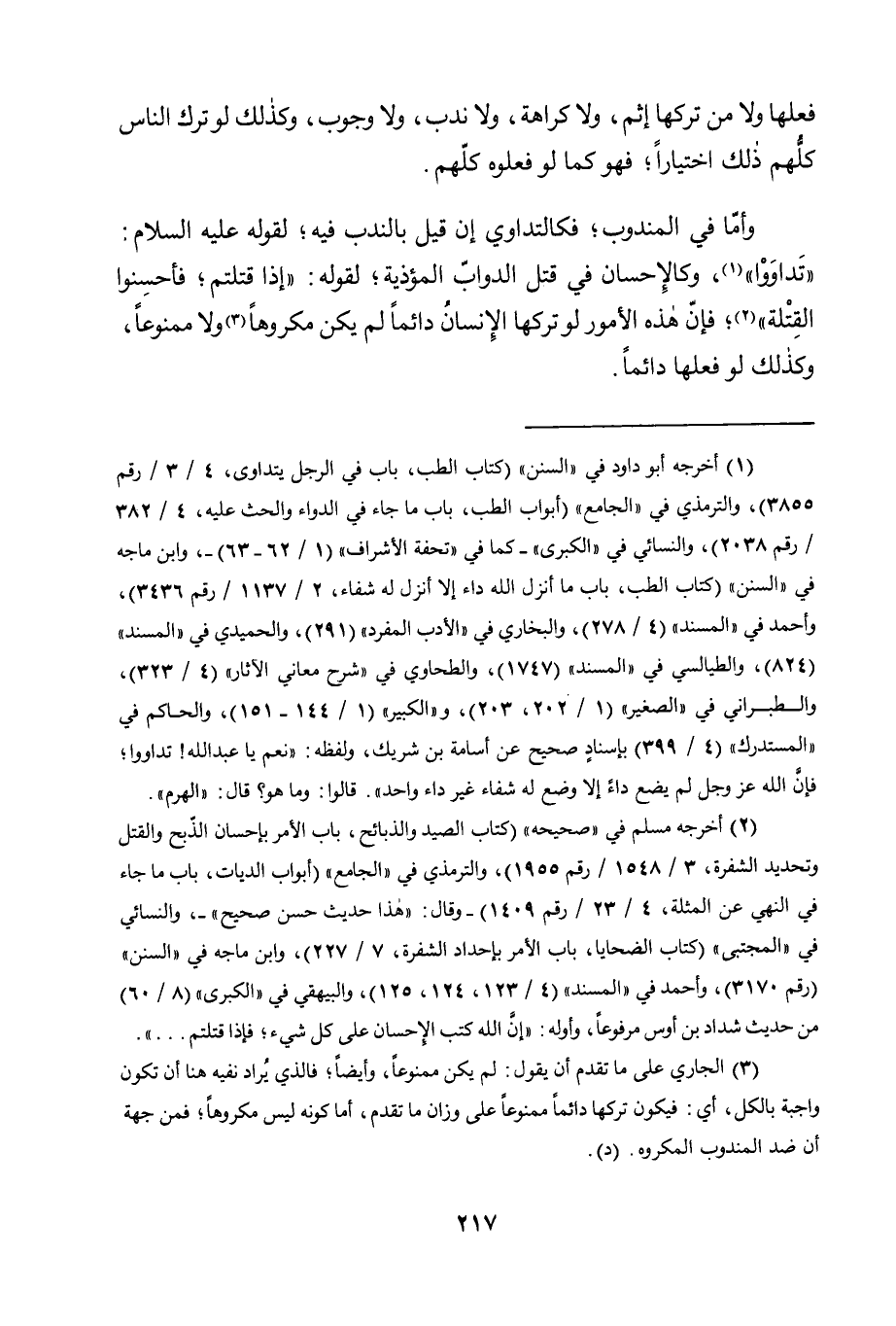 وَأَمَّا فِي الْمَنْدُوبِ؛ فَكَالتَّدَاوِي إِنْ قِيلَ بِالنَّدْبِ فِيهِ؛ لِقَوْلِهِ, عَلَيْهِ السَّلَامُ: "تَدَاوُوا" 1، وَكَالْإِحْسَانِ فِي قَتْلِ الدَّوَابِّ الْمُؤْذِيَةِ؛ لِقَوْلِهِ: "إِذَا قَتَلْتُمْ؛ فَأَحْسَنُوا الْقِتْلَةَ" 2؛ فَإِنَّ هَذِهِ الْأُمُورَ لَوْ تَرَكَهَا الْإِنْسَانُ دَائِمًا لَمْ يَكُنْ مَكْرُوهًا3 وَلَا ممنوعا، وكذلك لو فعلها دائما.