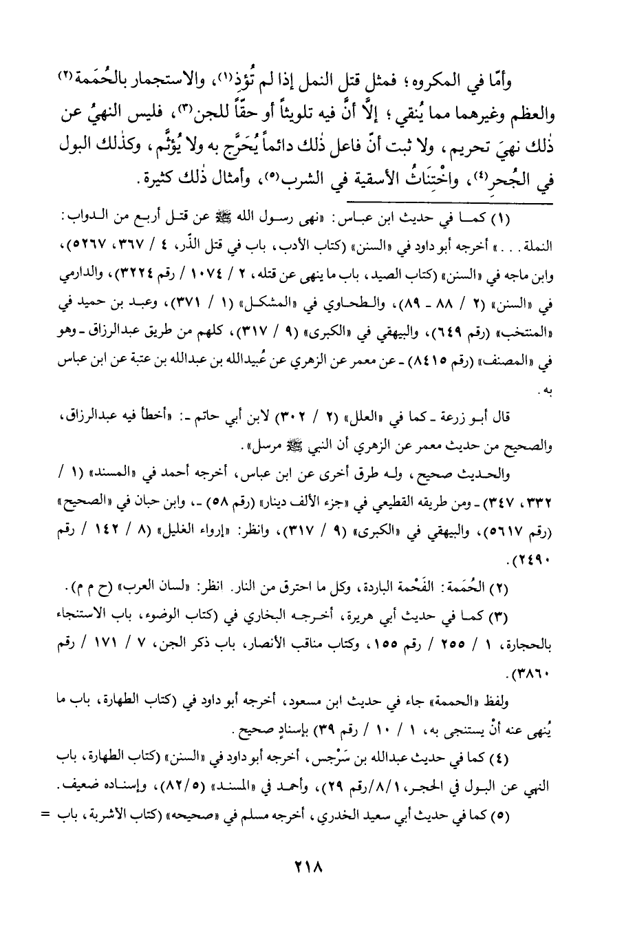 1 كما في حديث ابن عباس: "نهي رَسُولَ اللَّهِ -صَلَّى اللَّهُ عَلَيْهِ وَسَلَّمَ- عَنْ قتل أربع من الدواب: النملة ... " أخرجه أبو داود في "السنن" "كتاب الأدب, باب في قتل الذر، 4/ 367، 5267"، وابن ماجه في "السنن" "كتاب الصيد، باب ما ينهى عن قتله، 2/ 1074/ رقم 3224"، والدارمي في "السنن" "2/ 88-89", والطحاوي في "المشكل" "1/ 371"، وعبد بن حميد في "المنتخب" "رقم 649"، والبيهقي في "الكبرى" "9/ 317"، كلهم من طريق عبد الرزاق -وهو في "المصنف" "رقم 8415"- عن معمر عن الزهري عن عبيد الله بن عبد الله بن عتبة عن ابن عباس به.