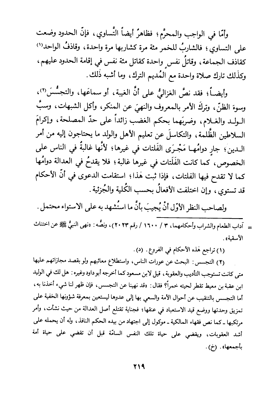 وَأَيْضًا؛ فَقَدْ نَصَّ الْغَزَّالِيُّ عَلَى أَنَّ الْغَيْبَةَ، أَوْ سَمَاعَهَا، وَالتَّجَسُّسَ2، وَسُوءَ الظَّنِّ، وَتَرْكَ الْأَمْرِ بِالْمَعْرُوفِ وَالنَّهْيِ عَنِ الْمُنْكَرِ، وَأَكْلَ الشُّبَهَاتِ، وَسَبَّ الْوَلَدِ وَالْغُلَامِ، وَضَرْبَهُمَا بِحُكْمِ الْغَضَبِ زَائِدًا عَلَى حَدِّ الْمَصْلَحَةِ، وَإِكْرَامَ السَّلَاطِينِ الظَّلَمَةِ، وَالتَّكَاسُلَ عَنْ تَعْلِيمِ الْأَهْلِ وَالْوَلَدِ مَا يَحْتَاجُونَ إِلَيْهِ مِنْ أَمْرِ الدِّينِ؛ جَارٍ دَوَامُهَا مَجْرَى الْفَلَتَاتِ فِي غَيْرِهَا؛ لِأَنَّهَا غَالِبَةٌ فِي النَّاسِ عَلَى الْخُصُوصِ، كَمَا كَانَتِ الْفَلَتَاتُ فِي غَيْرِهَا غَالِبَةً؛ فَلَا يَقْدَحُ فِي الْعَدَالَةِ دَوَامُهَا كَمَا لَا تَقْدَحُ فِيهَا الْفَلَتَاتُ، فَإِذَا ثَبَتَ هَذَا؛ اسْتَقَامَتِ الدَّعْوَى فِي أَنَّ الْأَحْكَامَ قَدْ تَسْتَوِي، وَإِنِ اخْتَلَفَتِ الْأَفْعَالُ بِحَسَبِ الْكُلِّيَّةِ وَالْجُزْئِيَّةِ.