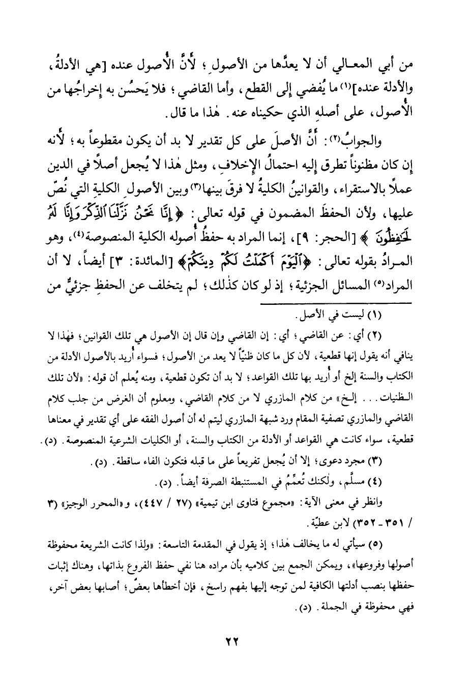 5 سيأتي له ما يخالف هذا؛ إذ يقول في المقدمة التاسعة: "ولذا كانت الشريعة محفوظة أصولها وفروعها"، ويمكن الجمع بين كلاميه بأن مراده هنا نفي حفظ الفروع بذاتها، وهناك إثبات حفظها بنصب أدلتها الكافية لمن توجه إليها بفهم راسخ، فإن أخطأها بعض؛ أصابها بعض آخر، فهي محفوظة في الجملة "د".