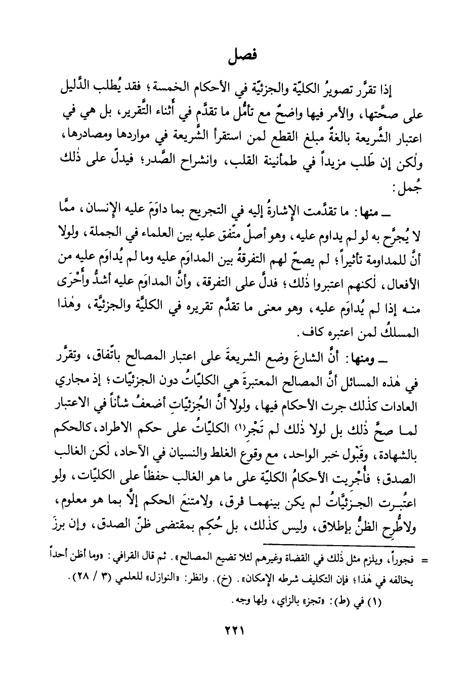 - وَمِنْهَا: أَنَّ الشَّارِعَ وَضَعَ الشَّرِيعَةَ عَلَى اعْتِبَارِ الْمَصَالِحِ بِاتِّفَاقٍ, وَتَقَرَّرَ فِي هَذِهِ الْمَسَائِلِ أَنَّ الْمَصَالِحَ الْمُعْتَبَرَةَ هِيَ الْكُلِّيَّاتُ دُونَ الْجُزْئِيَّاتِ؛ إِذْ مَجَارِي الْعَادَاتِ كَذَلِكَ جَرَتِ الْأَحْكَامُ فِيهَا، وَلَوْلَا أَنَّ الْجُزْئِيَّاتِ أَضْعَفُ شَأْنًا فِي الِاعْتِبَارِ لَمَا صَحَّ ذَلِكَ بَلْ لَوْلَا ذَلِكَ لَمْ تَجْرِ1 الْكُلِّيَّاتُ عَلَى حُكْمِ الِاطِّرَادِ، كَالْحُكْمِ بِالشَّهَادَةِ, وَقَبُولِ خَبَرِ الْوَاحِدِ، مَعَ وُقُوعِ الْغَلَطِ وَالنِّسْيَانِ فِي الْآحَادِ، لَكِنِ الْغَالِبُ الصِّدْقُ؛ فَأُجْرِيَتِ الْأَحْكَامُ الْكُلِّيَّةُ عَلَى مَا هُوَ الْغَالِبُ حِفْظًا عَلَى الْكُلِّيَّاتِ، وَلَوِ اعْتُبِرَتِ الْجُزْئِيَّاتُ لَمْ يَكُنْ بَيْنَهُمَا فَرْقٌ, وَلَامْتَنَعَ الْحُكْمُ إلا بما هو معلوم، ولا طرح الظَّنُّ بِإِطْلَاقٍ، وَلَيْسَ كَذَلِكَ, بَلْ حُكِمَ بِمُقْتَضَى ظن الصدق، وإن برز