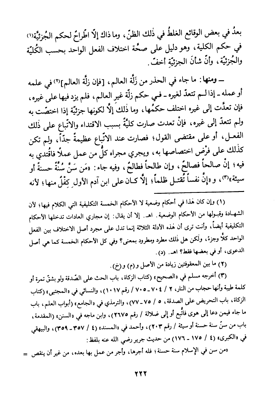 - وَمِنْهَا: مَا جَاءَ فِي الْحَذَرِ مِنْ زَلَّةِ الْعَالِمِ، [فَإِنَّ زَلَّةَ الْعَالِمِ] 2 فِي عِلْمِهِ أَوْ عَمَلِهِ -إِذَا لَمْ تَتَعَدَّ لِغَيْرِهِ- فِي حُكْمِ زَلَّةِ غَيْرِ الْعَالِمِ، فَلَمْ يَزِدْ فِيهَا عَلَى غَيْرِهِ، فَإِنْ تَعَدَّتْ إِلَى غَيْرِهِ اخْتَلَفَ حُكْمُهَا، وَمَا ذَلِكَ إِلَّا لِكَوْنِهَا جُزْئِيَّةً إِذَا اخْتَصَّتْ بِهِ وَلَمْ تَتَعَدَّ إِلَى غَيْرِهِ، فَإِنْ تَعَدَّتْ صَارَتْ كُلِّيَّةً بِسَبَبِ الِاقْتِدَاءِ وَالِاتِّبَاعِ عَلَى ذَلِكَ الْفِعْلِ، أَوْ عَلَى مُقْتَضَى الْقَوْلِ؛ فَصَارَتْ عِنْدَ الِاتِّبَاعِ عَظِيمَةً جِدًّا، وَلَمْ تَكُنْ كَذَلِكَ عَلَى فَرْضِ اخْتِصَاصِهَا بِهِ، وَيَجْرِي مجراه كل من عمل عَمَلًا فَاقْتَدَى بِهِ فِيهِ؛ إِنْ صَالِحًا فَصَالِحٌ، وَإِنْ طَالِحًا فَطَالِحٌ، وَفِيهِ جَاءَ: "مَنْ سَنَّ سُنَّةً حَسَنَةً أَوْ سَيِّئَةً" 3، وَ "إِنَّ نَفْسًا تُقْتَلُ ظُلْمًا؛ إِلَّا كَانَ عَلَى ابْنِ آدَمَ الأول كفل منها؛ لأنه