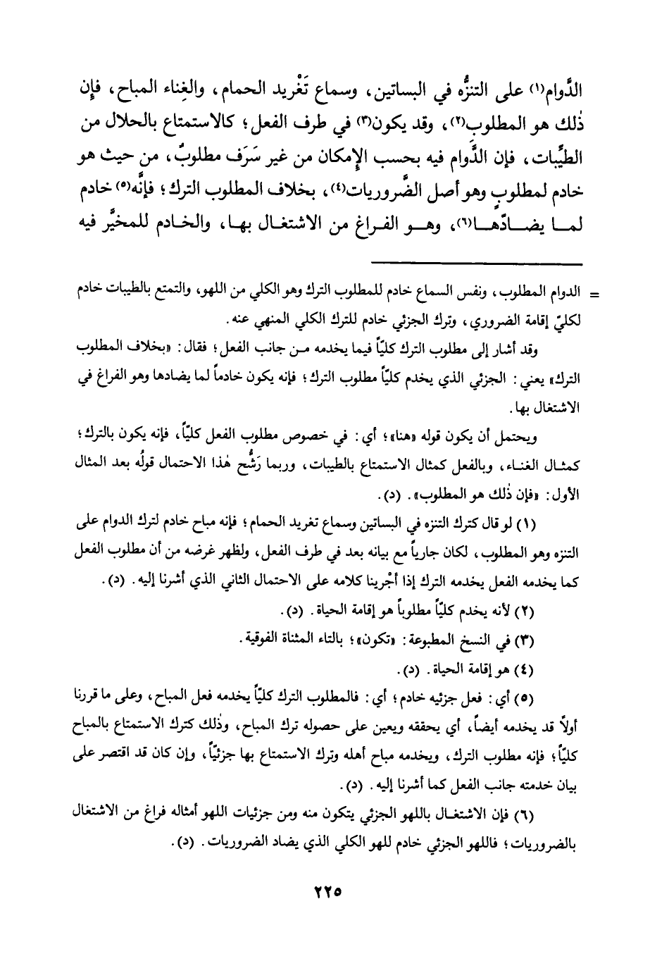 = الدوام المطلوب، ونفس السماع خادم للمطلوب الترك وهو الكلي من اللهو، والتمتع بالطيبات خادم لكلي إقامة الضروري، وترك الجزئي خادم للترك الكلي المنهي عنه.