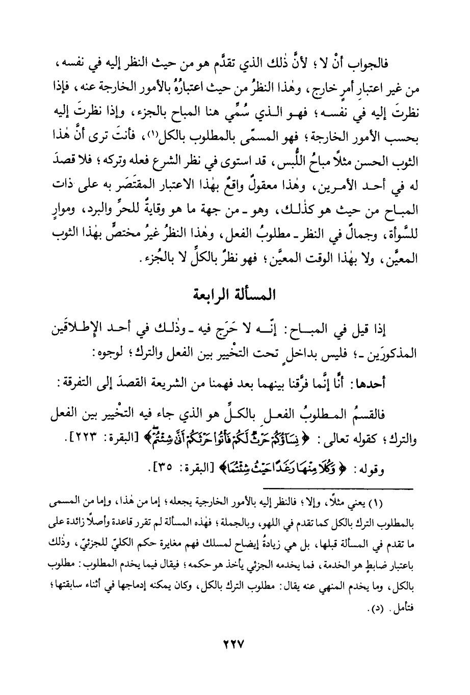 فَالْجَوَابُ أَنْ لَا؛ لِأَنَّ ذَلِكَ الَّذِي تَقَدَّمَ هُوَ مِنْ حَيْثُ النَّظَرُ إِلَيْهِ فِي نَفْسِهِ، مِنْ غَيْرِ اعْتِبَارِ أَمْرٍ خَارِجٍ، وَهَذَا النَّظَرُ مِنْ حَيْثُ اعْتِبَارُهُ بِالْأُمُورِ الْخَارِجَةِ عَنْهُ، فَإِذَا نَظَرْتَ إِلَيْهِ فِي نَفْسِهِ؛ فَهُوَ الَّذِي سُمِّيَ هُنَا الْمُبَاحَ بِالْجُزْءِ، وَإِذَا نَظَرْتَ إِلَيْهِ بِحَسَبِ الْأُمُورِ الْخَارِجَةِ؛ فَهُوَ الْمُسَمَّى بِالْمَطْلُوبِ بِالْكُلِّ1، فَأَنْتَ تَرَى أَنَّ هَذَا الثَّوْبَ الْحَسَنَ مَثَلًا مُبَاحُ اللُّبْسِ، قَدِ اسْتَوَى فِي نَظَرِ الشَّرْعِ فِعْلُهُ وَتَرْكُهُ؛ فَلَا قَصْدَ لَهُ فِي أَحَدِ الْأَمْرَيْنِ، وَهَذَا مَعْقُولٌ وَاقِعٌ بِهَذَا الِاعْتِبَارِ الْمُقْتَصَرِ بِهِ عَلَى ذَاتِ الْمُبَاحِ مِنْ حَيْثُ هُوَ كَذَلِكَ، وَهُوَ -مِنْ جِهَةِ مَا هُوَ وِقَايَةٌ لِلْحَرِّ وَالْبَرْدِ، وَمُوَارٍ لِلسَّوْأَةِ، وَجَمَالٌ فِي النَّظَرِ- مَطْلُوبُ الْفِعْلِ، وَهَذَا النَّظَرُ غَيْرُ مُخْتَصٍّ بِهَذَا الثَّوْبِ الْمُعَيَّنِ, وَلَا بِهَذَا الْوَقْتِ الْمُعَيَّنِ؛ فَهُوَ نَظَرٌ بالكل لا بالجزء.