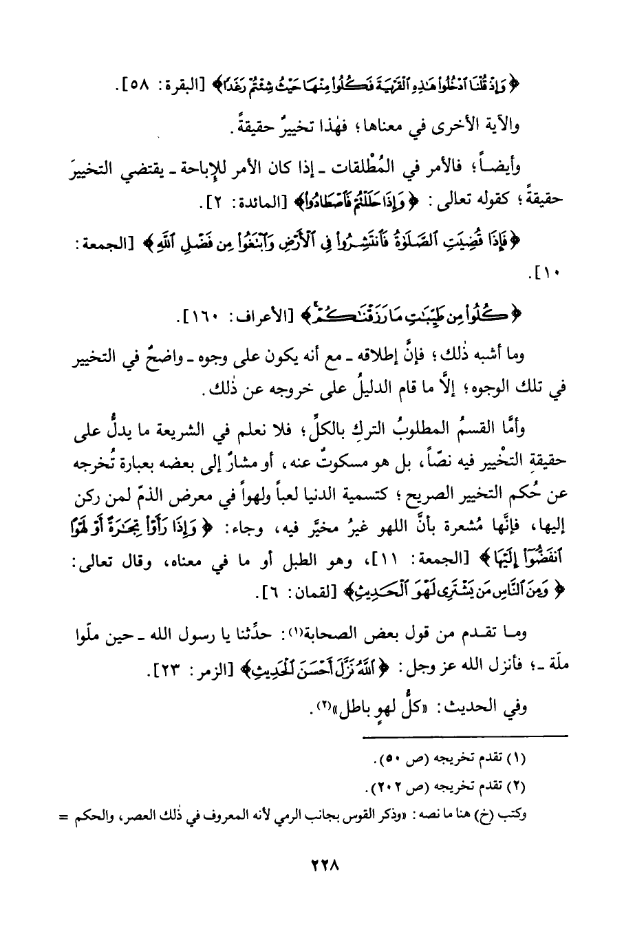 وَأَمَّا الْقِسْمُ الْمَطْلُوبُ التَّرْكِ بِالْكُلِّ؛ فَلَا نَعْلَمُ فِي الشَّرِيعَةِ مَا يَدُلُّ عَلَى حَقِيقَةِ التَّخْيِيرِ فِيهِ نَصًّا، بَلْ هُوَ مَسْكُوتٌ عَنْهُ، أَوْ مُشَارٌ إِلَى بَعْضِهِ بِعِبَارَةٍ تُخْرِجُهُ عَنْ حُكْمِ التَّخْيِيرِ الصَّرِيحِ؛ كَتَسْمِيَةِ الدُّنْيَا لَعِبًا وَلَهْوًا فِي مَعْرِضِ الذَّمِّ لِمَنْ رَكَنَ إِلَيْهَا، فَإِنَّهَا مُشْعِرَةٌ بِأَنَّ اللَّهْوَ غَيْرُ مُخَيَّرٍ فِيهِ، وَجَاءَ: {وَإِذَا رَأَوْا تِجَارَةً أَوْ لَهْوًا انْفَضُّوا إِلَيْهَا} [الْجُمْعَةِ: 11] ، وَهُوَ الطَّبْلُ أَوْ مَا فِي مَعْنَاهُ، وَقَالَ تَعَالَى: {وَمِنَ النَّاسِ مَنْ يَشْتَرِي لَهْوَ الْحَدِيثِ} [لُقْمَانَ: 6] .