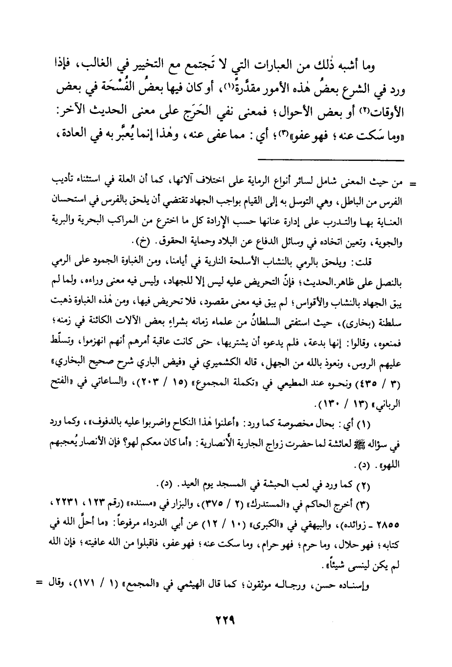 وَمَا أَشْبَهَ ذَلِكَ مِنَ الْعِبَارَاتِ الَّتِي لَا تَجْتَمِعُ مَعَ التَّخْيِيرِ فِي الْغَالِبِ، فَإِذَا وَرَدَ فِي الشَّرْعِ بَعْضُ هَذِهِ الْأُمُورِ مُقَدَّرَةً1، أَوْ كَانَ فِيهَا بَعْضُ الْفُسْحَةِ فِي بَعْضِ الْأَوْقَاتِ2 أَوْ بَعْضِ الْأَحْوَالِ؛ فَمَعْنَى نَفْيِ الْحَرَجِ عَلَى مَعْنَى الْحَدِيثِ الْآخَرِ: "وَمَا سُكِتَ عَنْهُ؛ فَهُوَ عفو" 3؛ أي: مما عفا عَنْهُ، وَهَذَا إِنَّمَا يُعَبَّرُ بِهِ فِي الْعَادَةِ،