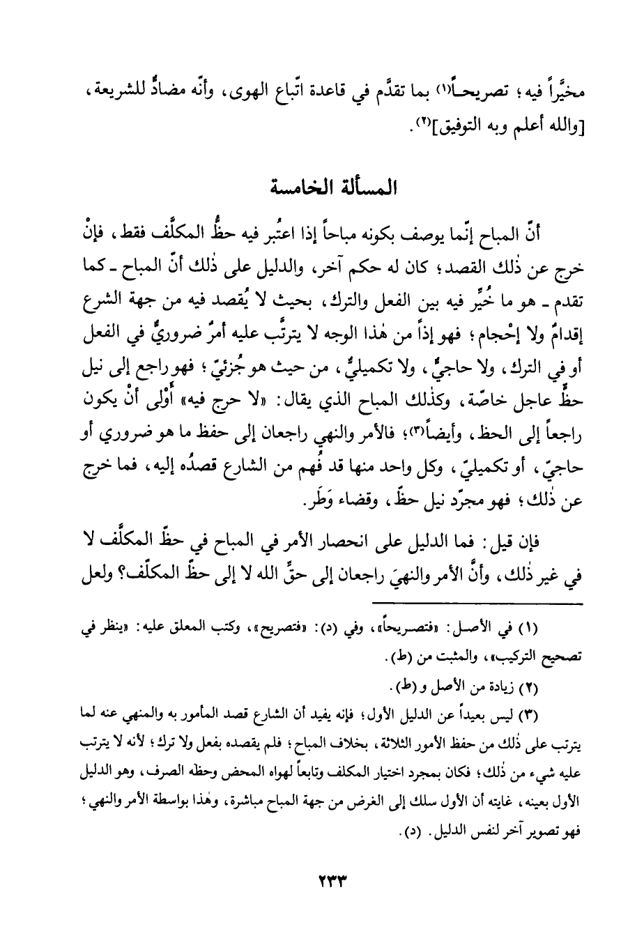 3 ليس بعيدا عن الدليل الأول؛ فإنه يفيد أن الشارع قصد المأمور به والمنهي عنه لما يترتب على ذلك من حفظ الأمور الثلاثة، بخلاف المباح؛ فلم يقصده بفعل ولا ترك؛ لأنه لا يترتب عليه شيء من ذلك؛ فكان بمجرد اختيار المكلف وتابعا لهواه المحض وحظه الصرف، وهو الدليل الأول بعينه، غايته أن الأول سلك إلى الغرض من جهة المباح مباشرة، وهذا بواسطة الأمر والنهي؛ فهو تصوير آخر لنفس الدليل. "د".