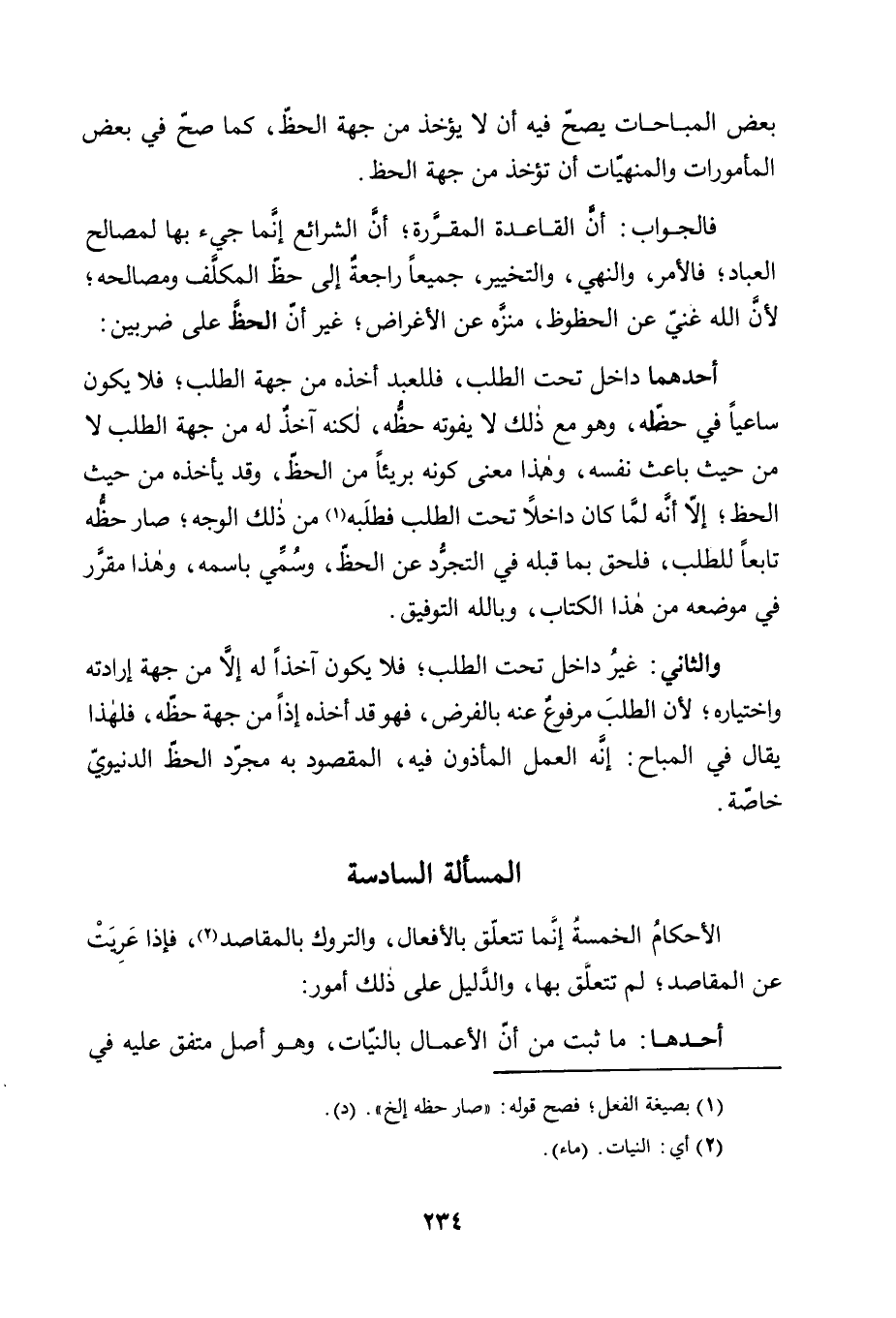 دَاخِلٌ تَحْتَ الطَّلَبِ، فَلِلْعَبْدِ أَخْذُهُ مِنْ جِهَةِ الطَّلَبِ؛ فلا يكون ساعيا في حضه, وَهُوَ مَعَ ذَلِكَ لَا يَفُوتُهُ حَظُّهُ، لَكِنَّهُ آخِذٌ لَهُ مِنْ جِهَةِ الطَّلَبِ لَا مِنْ حَيْثُ بَاعِثُ نَفْسِهِ، وَهَذَا مَعْنَى كَوْنِهِ بَرِيئًا مِنَ الْحَظِّ، وَقَدْ يَأْخُذُهُ مِنْ حَيْثُ الْحَظُّ؛ إِلَّا أَنَّهُ لَمَّا كَانَ دَاخِلًا تَحْتَ الطَّلَبِ فَطَلَبَهُ1 مِنْ ذَلِكَ الْوَجْهِ؛ صَارَ حَظُّهُ تَابِعًا لِلطَّلَبِ، فَلَحِقَ بِمَا قَبْلَهُ فِي التَّجَرُّدِ عَنِ الْحَظِّ، وَسُمِّيَ بِاسْمِهِ، وَهَذَا مُقَرَّرٌ فِي مَوْضِعِهِ مِنْ هَذَا الْكِتَابِ، وَبِاللَّهِ التَّوْفِيقُ.