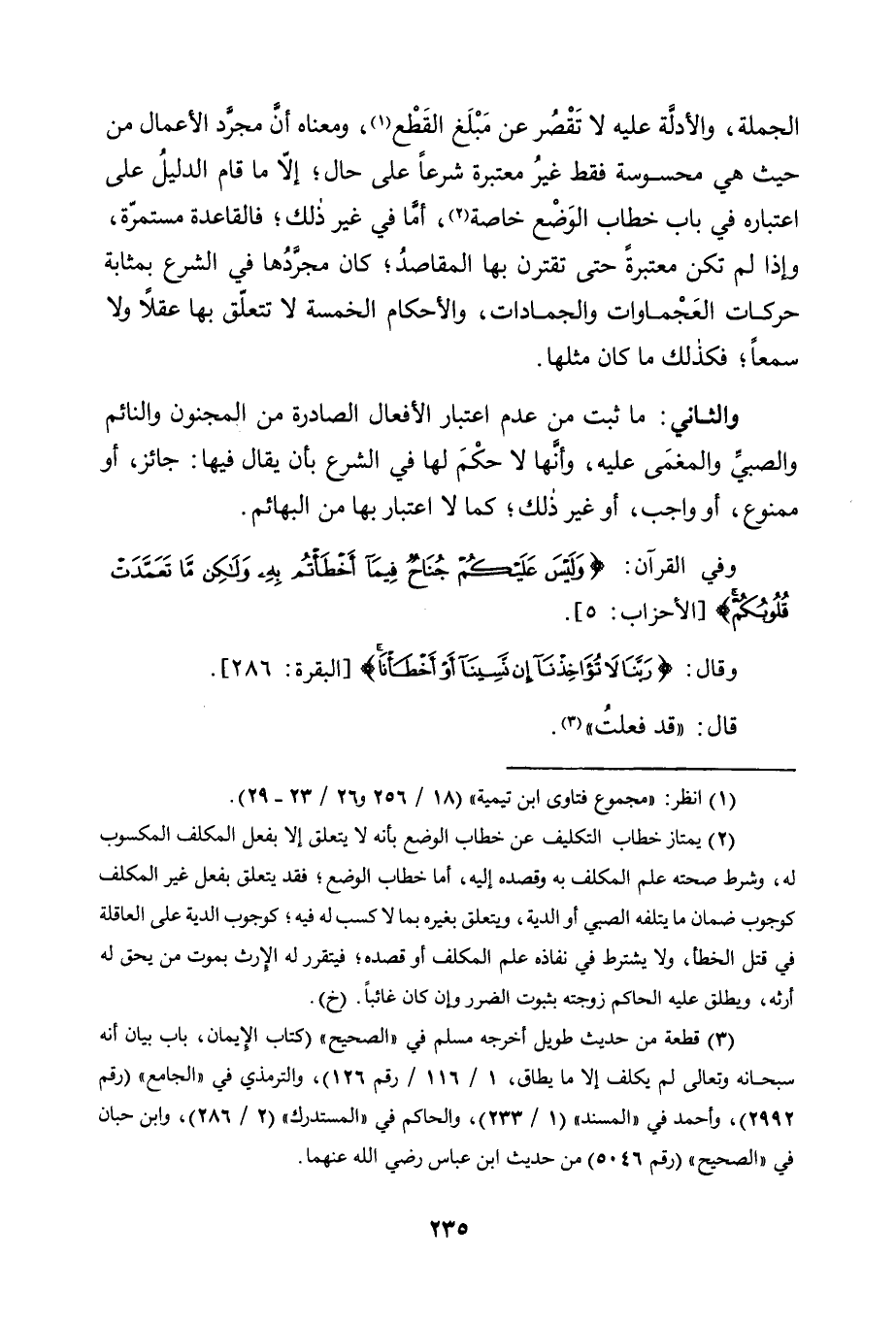 وَالثَّانِي: مَا ثَبَتَ مِنْ عَدَمِ اعْتِبَارِ الْأَفْعَالِ الصَّادِرَةِ مِنَ الْمَجْنُونِ وَالنَّائِمِ وَالصَّبِيِّ وَالْمُغْمَى عَلَيْهِ، وَأَنَّهَا لَا حُكْمَ لَهَا فِي الشَّرْعِ بِأَنْ يُقَالَ فِيهَا: جَائِزٌ، أَوْ مَمْنُوعٌ، أَوْ وَاجِبٌ، أَوْ غَيْرُ ذَلِكَ؛ كَمَا لَا اعْتِبَارَ بِهَا مِنَ الْبَهَائِمِ.