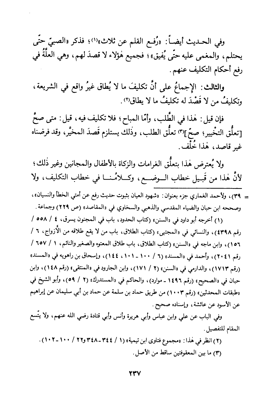 وَفِي الْحَدِيثِ أَيْضًا: "رُفِعَ الْقَلَمُ عَنْ ثَلَاثٍ" 1؛ فَذَكَرَ "الصَّبِيَّ حَتَّى يَحْتَلِمَ، وَالْمُغْمَى عَلَيْهِ حَتَّى يُفِيقَ"؛ فَجَمِيعُ هَؤُلَاءِ لَا قَصْدَ لَهُمْ، وَهِيَ الْعِلَّةُ فِي رَفْعِ أَحْكَامِ التَّكْلِيفِ عَنْهُمْ.