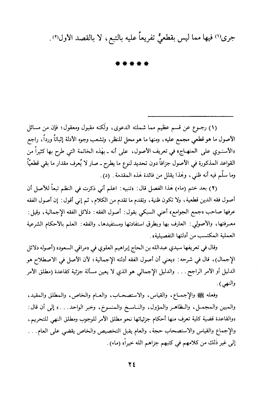 1 رجوع عن قسم عظيم مما شملته الدعوى، ولكنه مقبول ومعقول؛ فإن من مسائل الأصول ما هو قطعي مجمع عليه، ومنها ما هو محل للنظر، وتشعب وجوه الأدلة إثباتا وردا، راجع "الأسنوي على المنهاج" في تعريف الأصول على أنه -بهذه الخاتمة التي طرح بها كثيرا من القواعد المذكورة في الأصول جزافا دون تحديد لنوع ما يطرح- صار لا يُعرف مقدار ما بقي قطعيا وما سلم فيه أنه ظني، وهذا يقلل من فائدة هذه المقدمة. "د".
