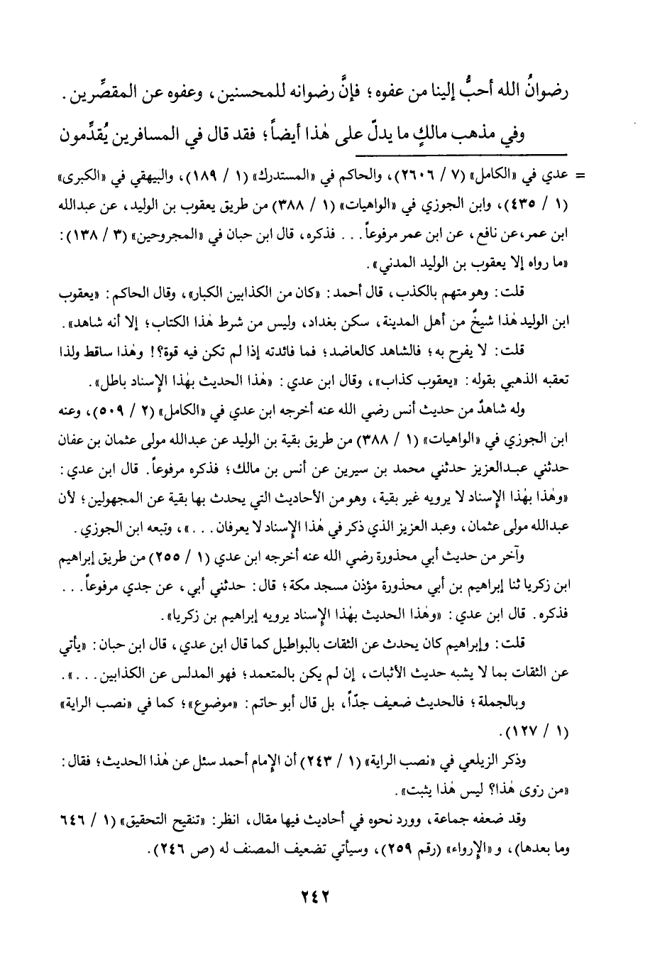 قلت: وهو متهم بالكذب، قال أحمد: "كان من الكذابين الكبار", وقال الحاكم: "يعقوب بن الوليد هذا شيخ من أهل المدينة، سكن بغداد، وليس من شرط هذا الكتاب؛ إلا أنه شاهد".