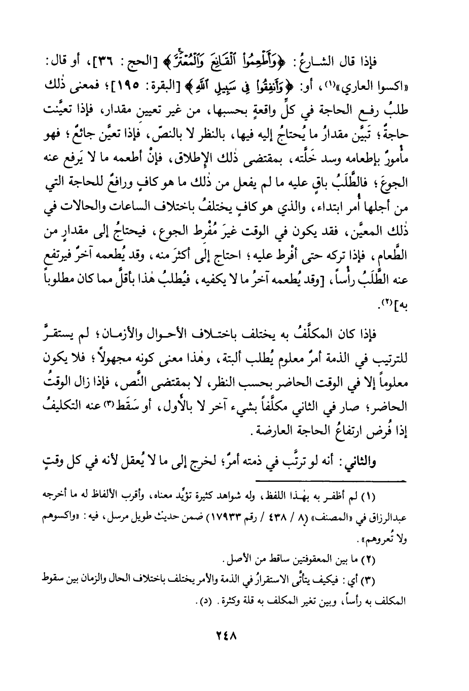 فَإِذَا كَانَ الْمُكَلَّفُ بِهِ يَخْتَلِفُ بِاخْتِلَافِ الْأَحْوَالِ وَالْأَزْمَانِ؛ لَمْ يَسْتَقِرَّ لِلتَّرْتِيبِ فِي الذِّمَّةِ أَمْرٌ مَعْلُومٌ يُطْلَبُ أَلْبَتَّةَ، وَهَذَا مَعْنَى كَوْنِهِ مَجْهُولًا؛ فَلَا يَكُونُ مَعْلُومًا إِلَّا فِي الْوَقْتِ الْحَاضِرِ بِحَسَبِ النَّظَرِ، لَا بِمُقْتَضَى النَّصِّ، فَإِذَا زَالَ الْوَقْتُ الْحَاضِرُ؛ صَارَ فِي الثَّانِي مُكَلَّفًا بِشَيْءٍ آخَرَ لَا بِالْأَوَّلِ، أَوْ سَقَطَ3 عَنْهُ التَّكْلِيفُ إِذَا فُرِضَ ارْتِفَاعُ الْحَاجَةِ الْعَارِضَةِ.