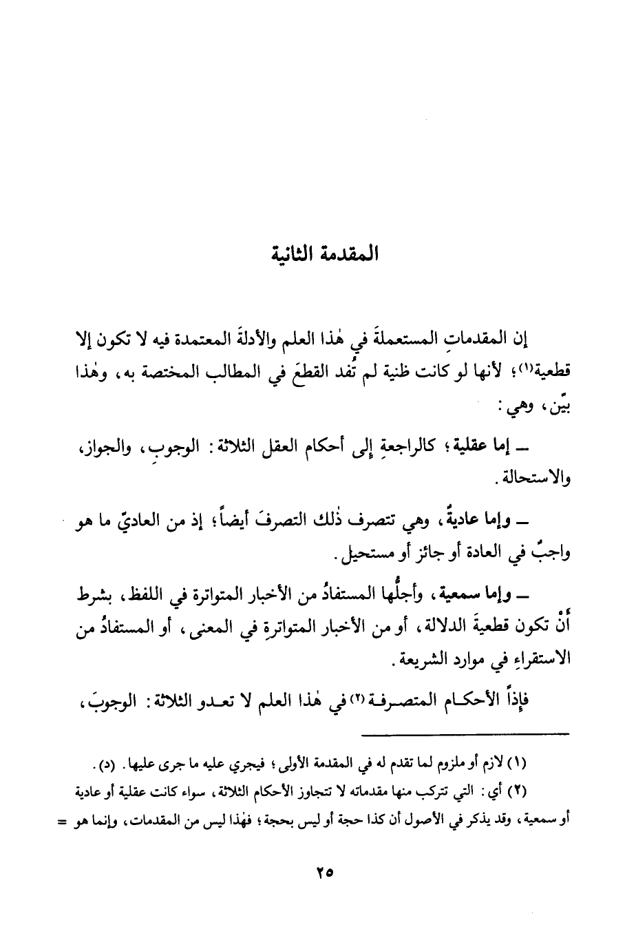 2 أي: التي تتركب منها مقدماته لا تتجاوز الأحكام الثلاثة، سواء كانت عقلية أو عادية أو سمعية، وقد يذكر في الأصول أن كذا حجة أو ليس بحجة؛ فهذا ليس من المقدمات، وإنما هو مما يتفرع على تلك المقدمات؛ إذ هو العرض الذاتي الذي يُراد إثباته لموضوعاته التي هي الأدلة بواسطة تلك المقدمات "د".