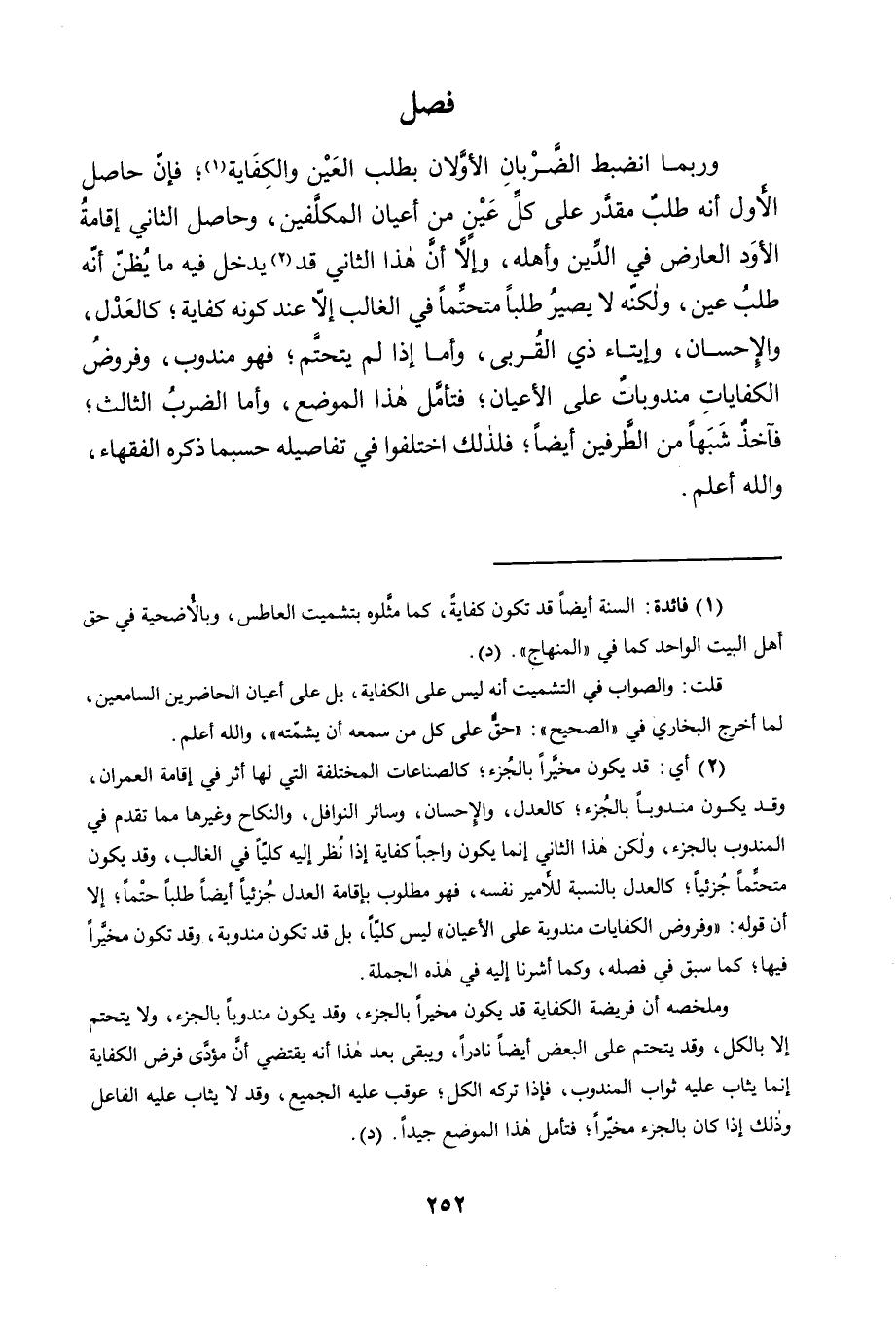 2 أي: قد يكون مخيرا بالجزء؛ كالصناعات المختلفة التي لها أثر في إقامة العمران، وقد يكون مندوبا بالجزء؛ كالعدل، والإحسان، وسائر النوافل، والنكاح وغيرها مما تقدم في المندوب بالجزء، ولكن هذا الثاني إنما يكون واجبا كفاية إذا نظر إليه كليا في الغالب، وقد يكون متحتما جزئيا؛ كالعدل بالنسبة للأمير نفسه، فهو مطلوب بإقامة العدل جزئيا أيضا طلبا حتما؛ إلا أن قوله: "وفروض الكفايات مندوبة على الأعيان" ليس كليا، بل قد تكون مندوبة, وقد تكون مخيرا فيها؛ كما سبق في فصله, وكما أشرنا إليه في هذه الجملة.