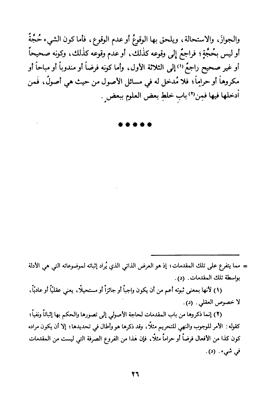 2 إنما ذكروها من باب المقدمات لحاجة الأصولي إلى تصورها والحكم بها إثباتا ونفيا؛ كقوله: الأمر للوجوب والنهي للتحريم مثلا، وقد ذكرها هو وأطال في تحديدها؛ إلا أن يكون مراده كون كذا من الأفعال فرضا أو حراما مثلا، فإن هذا من الفروع الصرفة التي ليست من المقدمات في شيء "د".