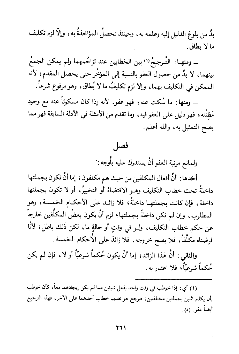 - وَمِنْهَا: التَّرْجِيحُ1 بَيْنَ الْخِطَابَيْنِ عند تزاحمهما ولم يمكن الجمع بنهما، لَا بُدَّ مِنْ حُصُولِ الْعَفْوِ بِالنِّسْبَةِ إِلَى الْمُؤَخَّرِ حَتَّى يَحْصُلَ الْمُقَدَّمُ؛ لِأَنَّهُ الْمُمْكِنُ فِي التَّكْلِيفِ بِهِمَا، وَإِلَّا لَزِمَ تَكْلِيفُ مَا لَا يُطَاقُ، وَهُوَ مَرْفُوعٌ شَرْعًا.