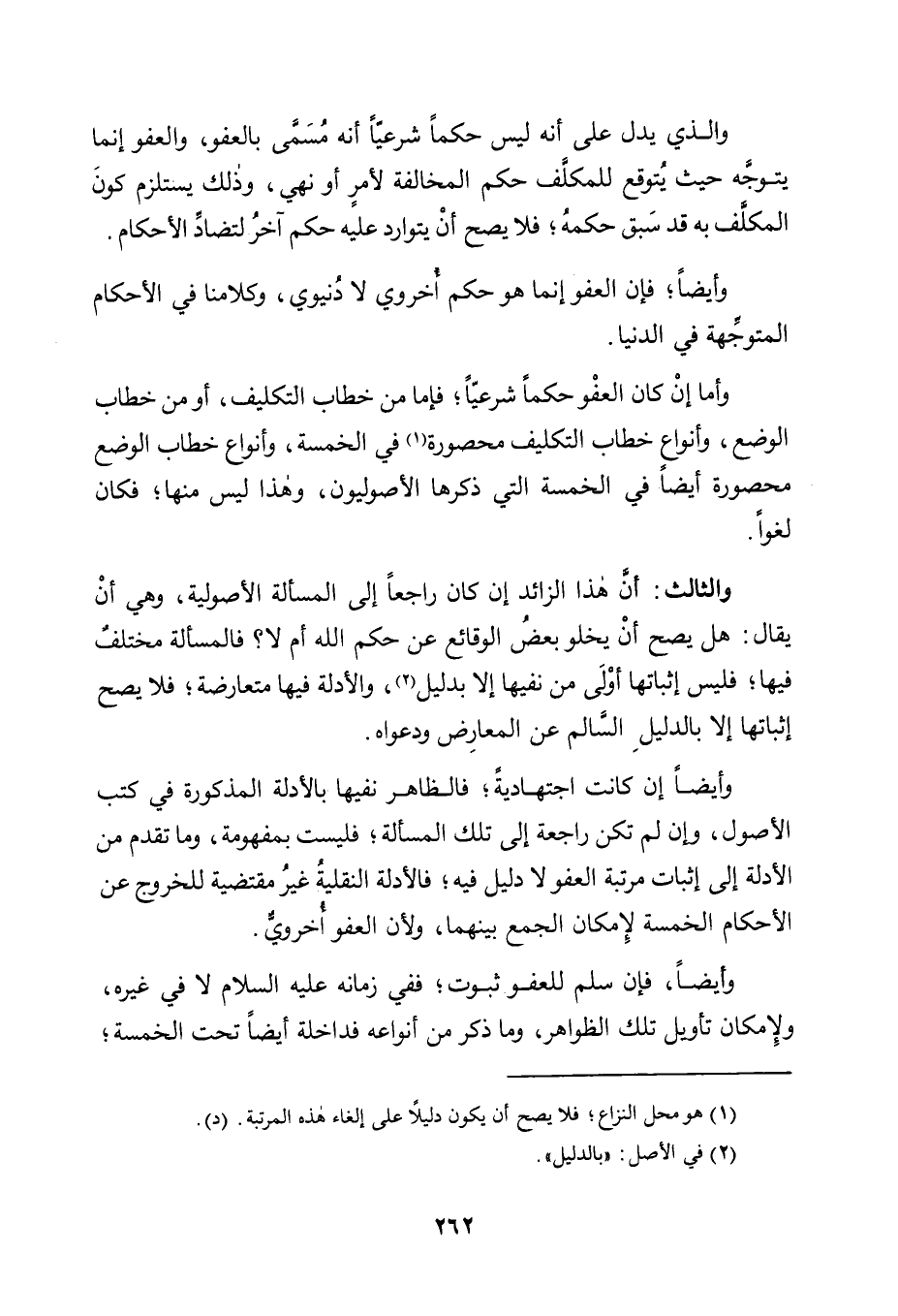 وَأَمَّا إِنْ كَانَ الْعَفْوُ حُكْمًا شَرْعِيًّا؛ فَإِمَّا مِنْ خِطَابِ التَّكْلِيفِ، أَوْ مِنْ خِطَابِ الْوَضْعِ، وَأَنْوَاعُ خِطَابِ التَّكْلِيفِ مَحْصُورَةٌ1 فِي الْخَمْسَةِ، وَأَنْوَاعُ خِطَابِ الْوَضْعِ مَحْصُورَةٌ أَيْضًا فِي الْخَمْسَةِ الَّتِي ذَكَرَهَا الْأُصُولِيُّونَ، وَهَذَا لَيْسَ مِنْهَا؛ فَكَانَ لَغْوًا.