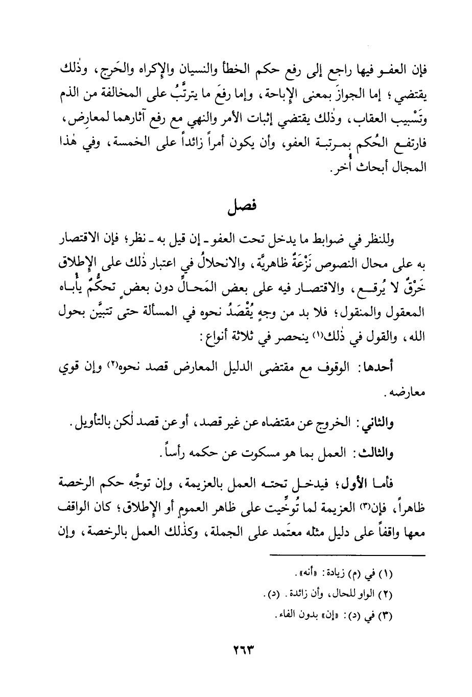 وَلِلنَّظَرِ فِي ضَوَابِطِ مَا يَدْخُلُ تَحْتَ الْعَفْوِ -إِنْ قِيلَ بِهِ- نَظَرٌ؛ فإن الاقتصار به على محال النصوص نزعة ظَاهِرِيَّةٌ، وَالِانْحِلَالُ فِي اعْتِبَارِ ذَلِكَ عَلَى الْإِطْلَاقِ خَرْقٌ لَا يُرَقَّعُ، وَالِاقْتِصَارُ فِيهِ عَلَى بَعْضِ الْمَحَالِّ دُونَ بَعْضٍ تَحَكُّمٌ يَأْبَاهُ الْمَعْقُولُ وَالْمَنْقُولُ؛ فَلَا بُدَّ مِنْ وَجْهٍ يُقْصَدُ نَحْوُهُ فِي الْمَسْأَلَةِ حَتَّى تَتَبَيَّنَ بِحَوْلِ اللَّهِ، وَالْقَوْلُ فِي ذَلِكَ1 يَنْحَصِرُ فِي ثَلَاثَةِ أَنْوَاعٍ: