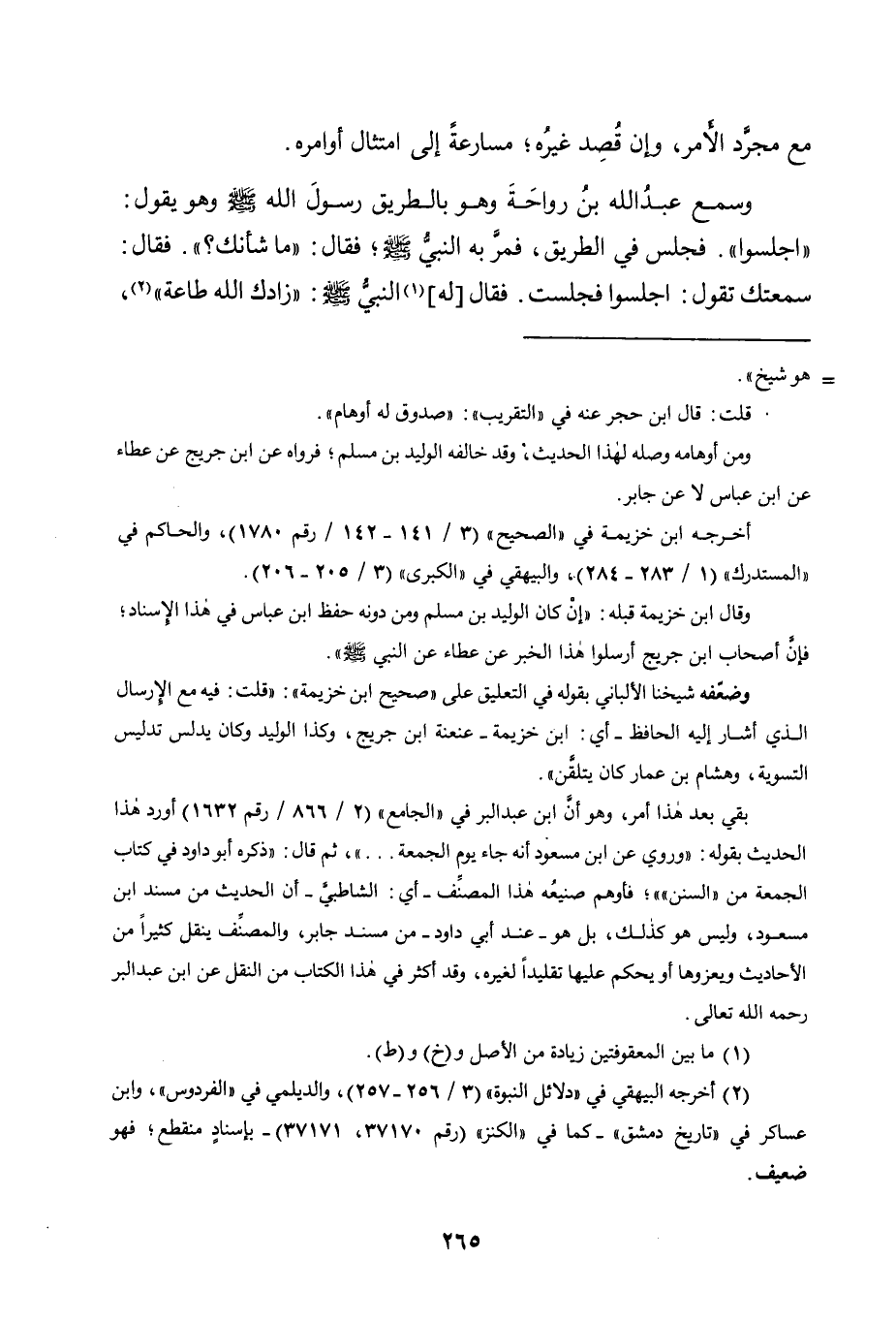 وَسَمِعَ عَبْدُ اللَّهِ بْنُ رَوَاحَةَ وَهُوَ بِالطَّرِيقِ رَسُولَ اللَّهِ -صَلَّى اللَّهُ عَلَيْهِ وَسَلَّمَ- وَهُوَ يَقُولُ: "اجْلِسُوا ". فَجَلَسَ فِي الطَّرِيقِ، فَمَرَّ بِهِ النَّبِيُّ -صَلَّى اللَّهُ عَلَيْهِ وَسَلَّمَ- فَقَالَ: "مَا شَأْنُكَ؟ ". فَقَالَ: سَمِعْتُكَ تَقُولُ: اجلسوا فجلست. فَقَالَ [لَهُ] 1 النَّبِيُّ, صَلَّى اللَّهُ عَلَيْهِ وَسَلَّمَ: "زادك الله طاعة" 2،