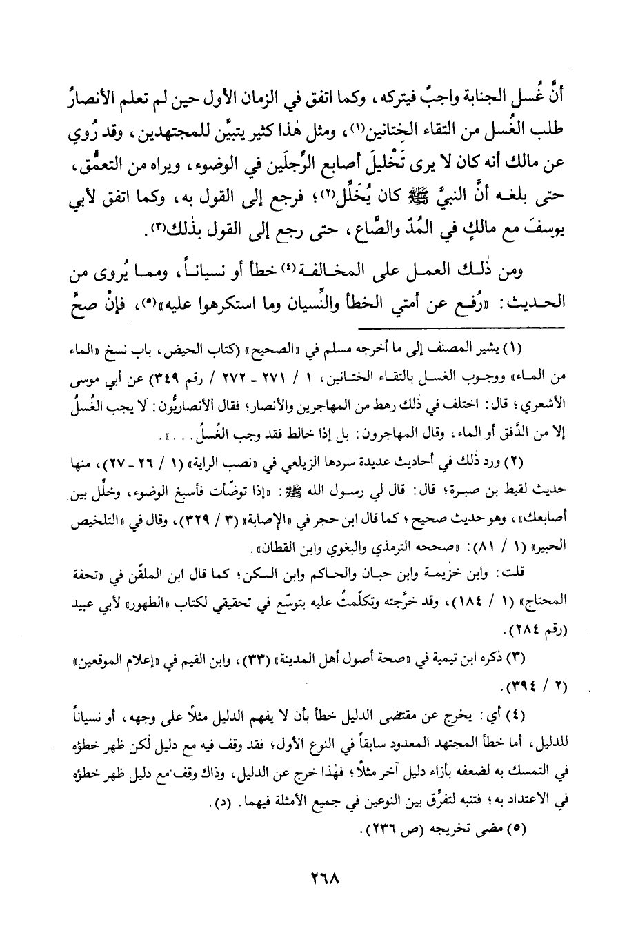 أَنَّ غُسْلَ الْجَنَابَةِ وَاجِبٌ فَيَتْرُكُهُ، وَكَمَا اتَّفَقَ فِي الزَّمَانِ الْأَوَّلِ حِينَ لَمْ تَعْلَمِ الْأَنْصَارُ طَلَبَ الْغُسْلِ مِنِ الْتِقَاءِ الْخِتَانَيْنِ1، وَمِثْلُ هَذَا كَثِيرٌ يَتَبَيَّنُ لِلْمُجْتَهِدِينَ، وَقَدْ رُوِيَ عَنْ مَالِكٍ أَنَّهُ كَانَ لَا يَرَى تَخْلِيلَ أَصَابِعِ الرِّجْلَيْنِ فِي الْوُضُوءِ، وَيَرَاهُ مِنَ التَّعَمُّقِ، حَتَّى بَلَغَهُ أَنَّ النَّبِيَّ -صَلَّى اللَّهُ عَلَيْهِ وَسَلَّمَ- كَانَ يُخَلِّلُ2؛ فَرَجَعَ إِلَى الْقَوْلِ بِهِ، وَكَمَا اتَّفَقَ لِأَبِي يُوسُفَ مَعَ مَالِكٍ فِي الْمُدِّ وَالصَّاعِ، حَتَّى رَجَعَ إِلَى الْقَوْلِ بِذَلِكَ3.