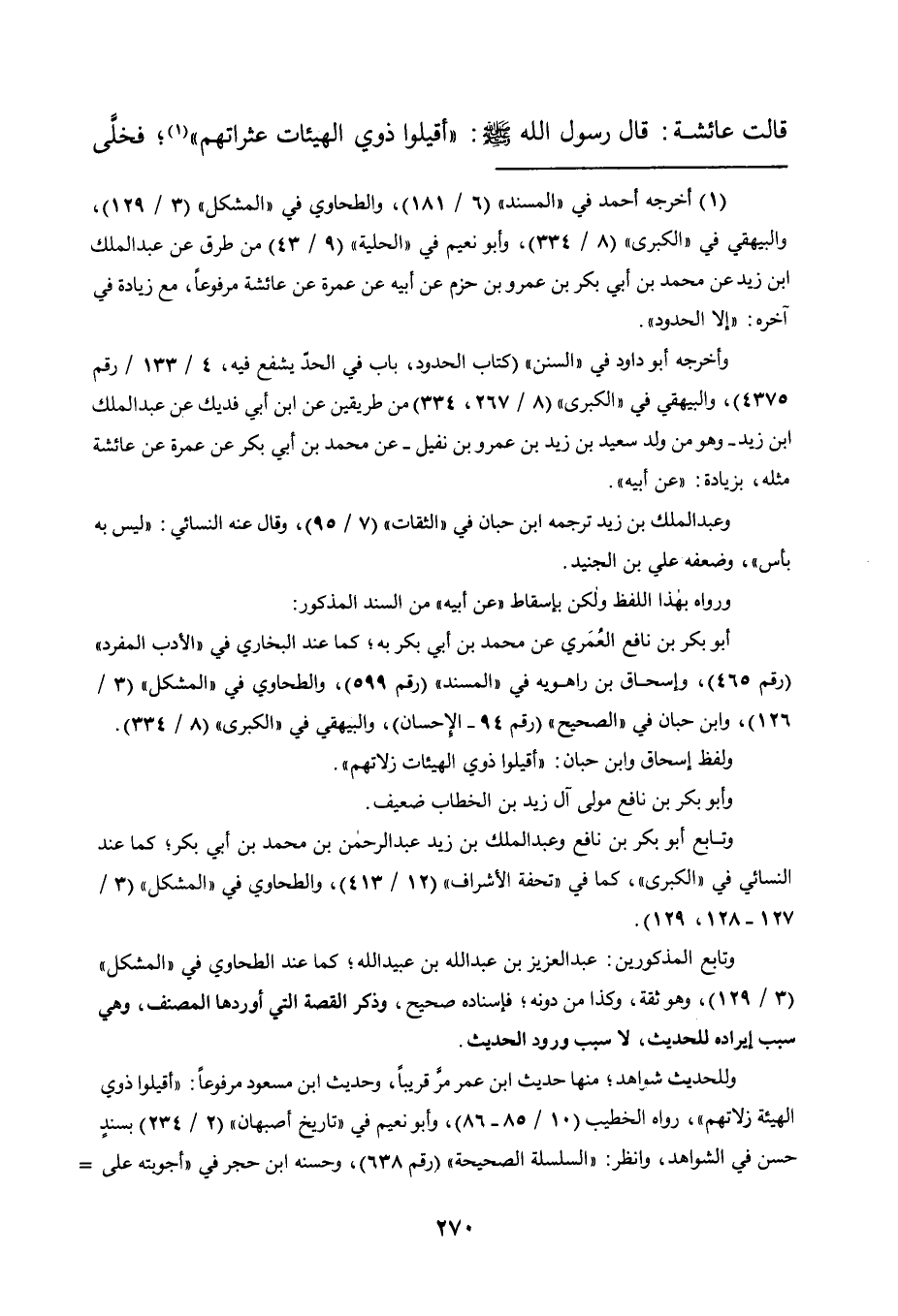 قَالَتْ عَائِشَةُ: قَالَ رَسُولُ اللَّهِ, صَلَّى اللَّهُ عَلَيْهِ وَسَلَّمَ: "أَقِيلُوا ذَوِي الْهَيْئَاتِ عَثَرَاتِهِمْ" 1 فَخَلَّى