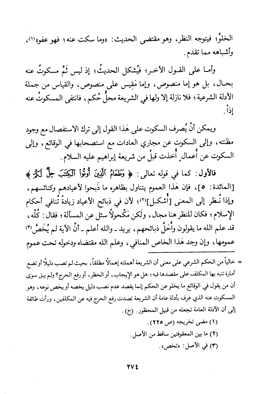 وَيُمْكِنُ أَنْ يُصْرَفَ السُّكُوتُ عَلَى هَذَا الْقَوْلِ إِلَى تَرْكِ الِاسْتِفْصَالِ مَعَ وُجُودِ مَظِنَّتِهِ، وَإِلَى السُّكُوتِ عَنْ مَجَارِي الْعَادَاتِ مَعَ اسْتِصْحَابِهَا فِي الْوَقَائِعِ، وَإِلَى السُّكُوتِ عَنْ أَعْمَالٍ أُخِذَتْ قَبْلُ مِنْ شَرِيعَةِ إِبْرَاهِيمَ, عَلَيْهِ السَّلَامُ.