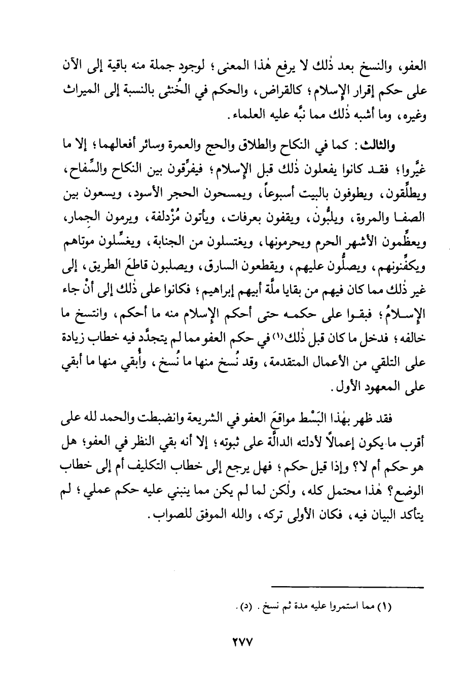 الْعَفْوِ، وَالنَّسْخُ بَعْدَ ذَلِكَ لَا يَرْفَعُ هَذَا الْمَعْنَى؛ لِوُجُودِ جُمْلَةٍ مِنْهُ بَاقِيَةٍ إِلَى الْآنَ عَلَى حُكْمِ إِقْرَارِ الْإِسْلَامِ؛ كَالْقِرَاضِ، وَالْحُكْمِ فِي الْخُنْثَى بِالنِّسْبَةِ إِلَى الْمِيرَاثِ وَغَيْرِهِ، وَمَا أَشْبَهَ ذَلِكَ مِمَّا نَبَّهَ عَلَيْهِ الْعُلَمَاءُ.