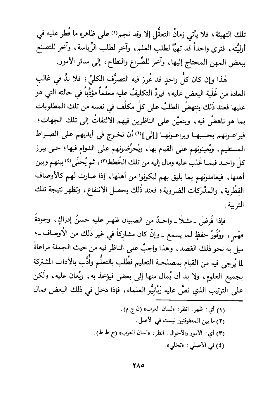 تِلْكَ التَّهْيِئَةَ؛ فَلَا يَأْتِي زَمَانُ التَّعَقُّلِ إِلَّا وَقَدْ نَجَمَ1 عَلَى ظَاهِرِهِ مَا فُطِرَ عَلَيْهِ فِي أَوَّلِيَّتِهِ، فَتَرَى وَاحِدًا قَدْ تَهَيَّأَ لِطَلَبِ الْعِلْمِ، وَآخَرَ لِطَلَبِ الرِّيَاسَةِ، وَآخَرَ لِلتَّصَنُّعِ بِبَعْضِ الْمِهَنِ الْمُحْتَاجِ إِلَيْهَا, وَآخَرَ لِلصِّرَاعِ وَالنِّطَاحِ، إِلَى سَائِرِ الْأُمُورِ.
